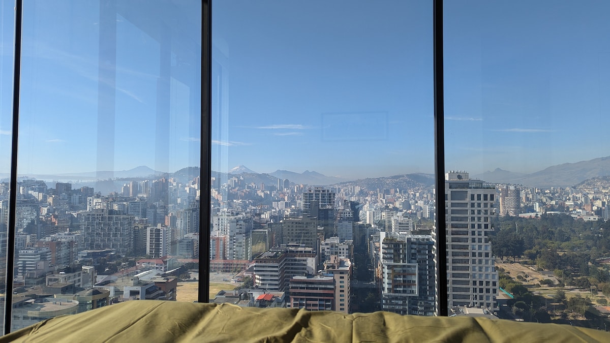 Loft moderne au 21e étage, nouveau bâtiment avec générateur de lumière autonome, idéal pour un voyage d'affaires ou pour une occasion spéciale, vue unique sur la ville. Emplacement privilégié dans le centre nord de Quito à côté du parc La Carolina, et à seulement quelques pas, vous trouverez des centres commerciaux et des institutions financières. Le service comprend un parking, une connexion Wi-Fi, un home cinéma, une baignoire, de l'eau chaude, un lave-linge/sèche-linge commun, des articles d'hygiène, une salle de sport et une piscine.
