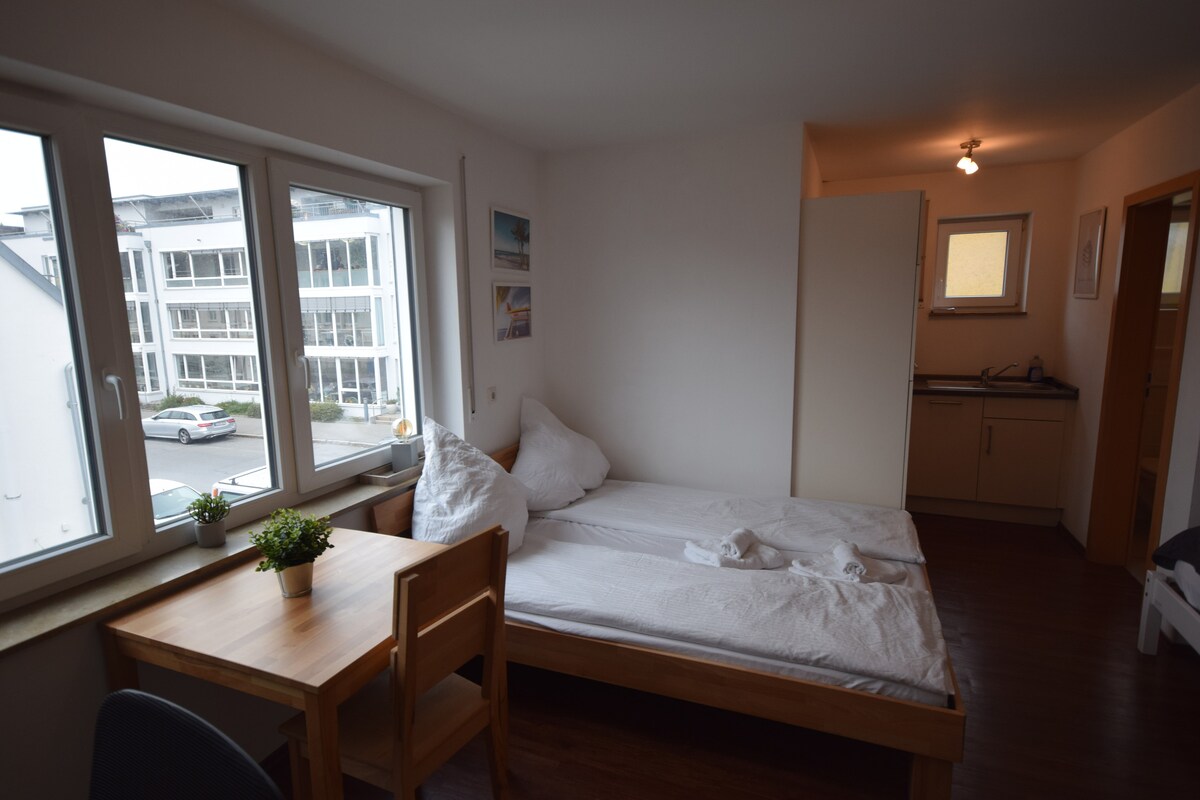 Un appartement calme au rez-de-chaussée dans une grande maison individuelle avec entrée séparée et parking privé. Grand studio avec lit double, canapé, fauteuils, télévision, Wi-Fi, sélection de DVD et de livres ainsi qu'une petite table de travail. Cuisine et salle de bain séparées. Une chaise haute et un lit bébé sont disponibles sur demande. Un restaurant italien, une boulangerie, une pharmacie et un supermarché sont accessibles à pied. Un vélo pour homme est à disposition à la location. Service de bus local vers Biberach (ligne 2)