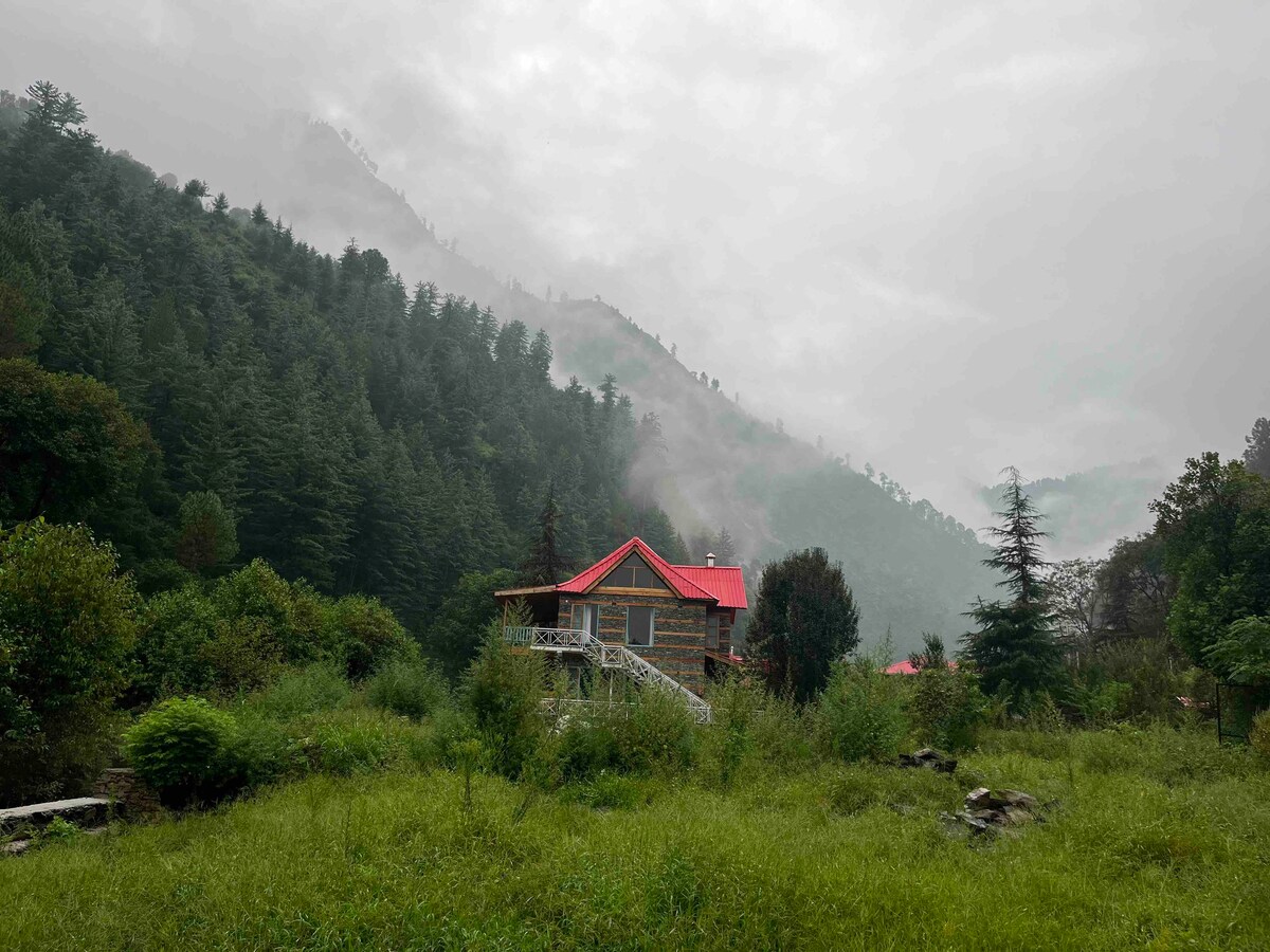 Évadez-vous dans une maison de montagne au bord d'un ruisseau près de Naggar, entourée de forêts de deodars et de vergers de pommiers. Écoutez l'eau du glacier couler, profitez d'une chambre confortable, d'un salon spacieux, d'une cuisine équipée et d'un coin salon extérieur privé pour les cafés du lever du soleil ou les feux du coucher du soleil. Une retraite paisible avec connexion WiFi de secours, confort moderne et sentiers de randonnée juste à votre porte : parfait pour les couples, les amis ou les voyageurs en solo à la recherche de nature et de calme. La femme de ménage garde l'endroit bien rangé afin que vous puissiez vous détendre et profiter.