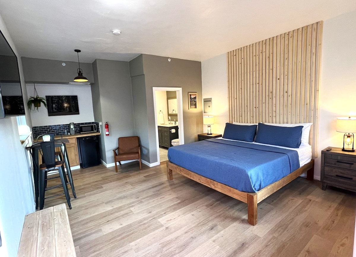 1 lit Queen Size, chambre non-fumeur avec mini-cuisette (mini-réfrigérateur, micro-ondes, table/chaises, évier de cuisine, comptoirs et armoires. Pas DE CUISINIÈRE. Cafetière avec café fourni. Wi-Fi gratuit. Animaux acceptés (20 $ de frais supplémentaires pour les animaux de compagnie. Chiens uniquement. 2 chiens max. Toutes les tailles/races sont les bienvenues. Sans frais pour les chiens d'assistance) Lit pliant double disponible (DISPONIBILITÉ LIMITÉE. DOIT être RÉSERVÉ À L'AVANCE, frais DE 20 $ / nuit) taxe DE séjour DE 6 % ajoutée. LA VUE SUR LE LAC DÉPEND DU NIVEAU DE L'EAU DU LAC.