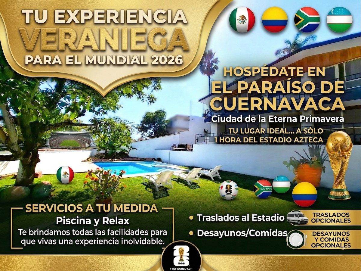 Situé dans un endroit central de Cuernavaca, Morelos, à proximité des centres commerciaux et des supermarchés les plus importants de la ville. En outre, il y a un Oxxo à seulement 500 mètres. Installations : Maison privée pouvant accueillir jusqu’à 7 personnes, 3 chambres climatisées, piscine et jacuzzi, cuisine équipée, barbecue et connexion Wi-Fi. La climatisation de la piscine avec chaudière à gaz est disponible moyennant un supplément. Nous acceptons les animaux ! Arrivée : 15 h Départ : 12 h 00