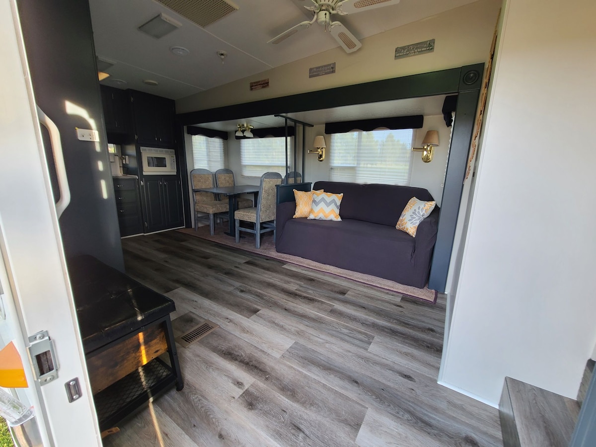 **Améliorations extérieures pour la saison 2023, foyer, les photos sont en ligne maintenant (le bois de chauffage est inclus dans le séjour) ! Reconnectez avec la nature dans ce camping-car confortable dans les Black Hills du Dakota du Sud. Équipé de tous les équipements les plus recherchés pour que vous vous sentiez comme chez vous. Ce camping-car à cinq roues mesure 32 pieds de long avec 2 grandes extensions, ce qui le rend très spacieux à l'intérieur. Il dispose d'un lit Queen Size dans la chambre principale ainsi que d'un lit gigogne complet dans le séjour.