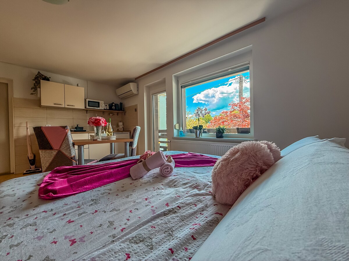 Ce charmant appartement d'une chambre dans un village idyllique à seulement 3 km de Bled est un mélange fantastique de nature, de tradition et d'équipements modernes. Profitez de votre café du matin sur le patio du jardin ou sur le balcon, cuisinez quelque chose de délicieux dans la cuisine peinte à la main, détendez-vous dans le sauna, détendez-vous dans le salon confortable et dormez le sommeil des heureux dans le lit en chêne fait à la main qui est la star absolue de l'appartement. UN ENDROIT HEUREUX !