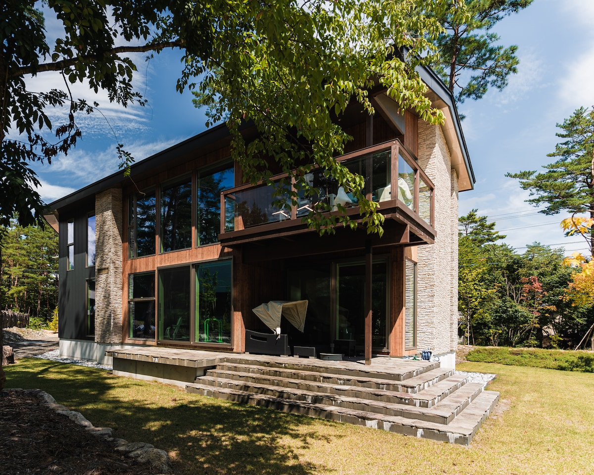 Located in Yatsugatake, Nagano,known for its beautiful nature and is also a popular holiday spot. Our villa is 650 sq m and has a 2-acre garden. We have 6 bedrooms, 2 shower rooms, a spacious living room to relax.Piano, karaoke are available for your entertainment! Golf, hiking, hot spring, paragliding, horseback riding and skiing are just some activities you can enjoy. We recommend you rent a car in advance. It's a 20 min drive from JR Kobuchizawa sta.