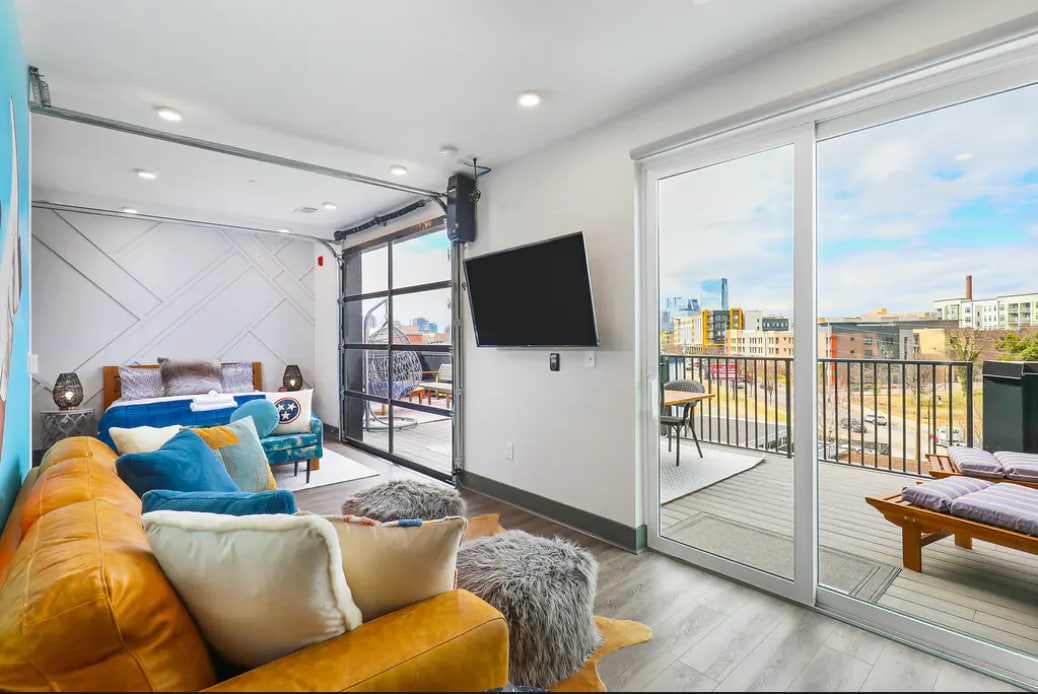 Experience Nashville in style at this truly special studio escape near the heart of downtown. Everything from the western-inspired mural to the contemporary furnishings throughout will make you slip right into the vacation mindset the moment you arrive. And, there will be no better place to sip a morning coffee or evening cocktail in bliss than the furnished balcony boasting a swinging chair, outdoor dining table, and sweeping city views. New in 2023 a Morgan Wallen themed speakeasy.