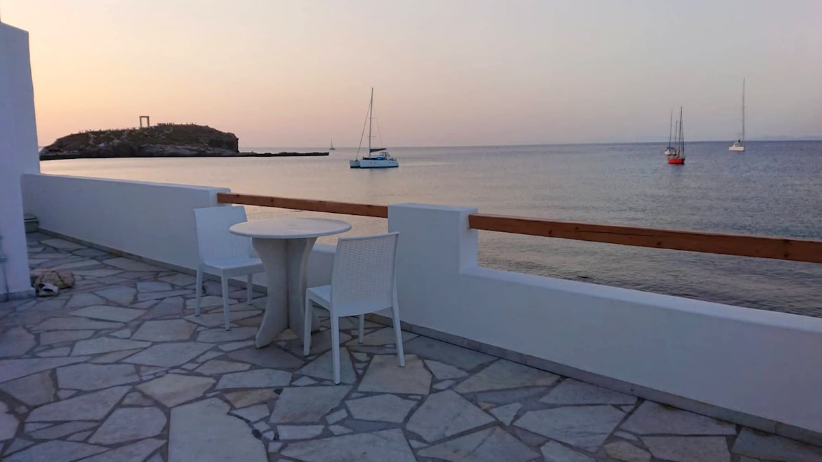 Vous pouvez profiter d'une vue latérale sur la mer et comme vous pouvez le voir sur les photos, il est à 15 pas de la mer. À 10 mètres, il y a le café FLISVOS - bar-restaurant, où vous pouvez profiter de votre repas que vous voulez pendant la journée de cocktails ou de petit-déjeuner . À côté des chambres, vous trouverez le club de sports nautiques FLISVOS, ainsi qu'une belle plage de sable fin avec chaises longues. Vous trouverez mon logement à 10-15 minutes à pied du centre de la ville de Naxos (Chora) , à 10 minutes en voiture du port de Chora et à 30-40 minutes à pied avec des bagages.