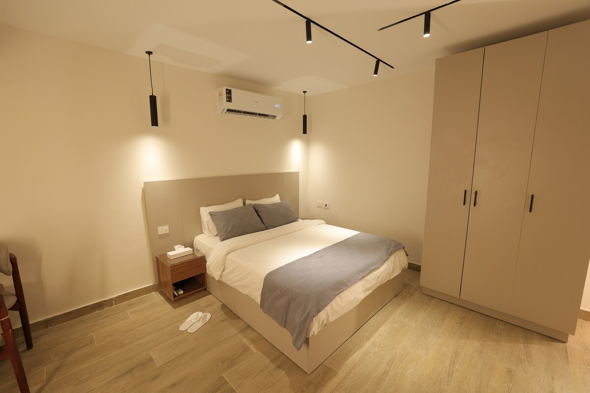 Bienvenue dans nos studios confortables près de l'aéroport et de la « 90 rue » du Nouveau Caire. Idéal pour les voyageurs en solo, les familles et les amis, nos spacieux studios de 45 m2 offrent intimité et confort. Avec des entrées privées, la climatisation, le Wi-Fi, la télévision et les équipements de base, profitez de l'ambiance et de la sécurité de notre complexe surveillé.