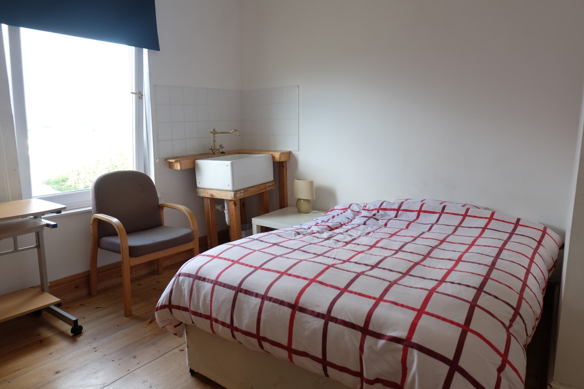 Chambre double avec lit King Size, salle d'eau privée avec toilettes. Buanderie avec micro-ondes, bouilloire et grille-pain.