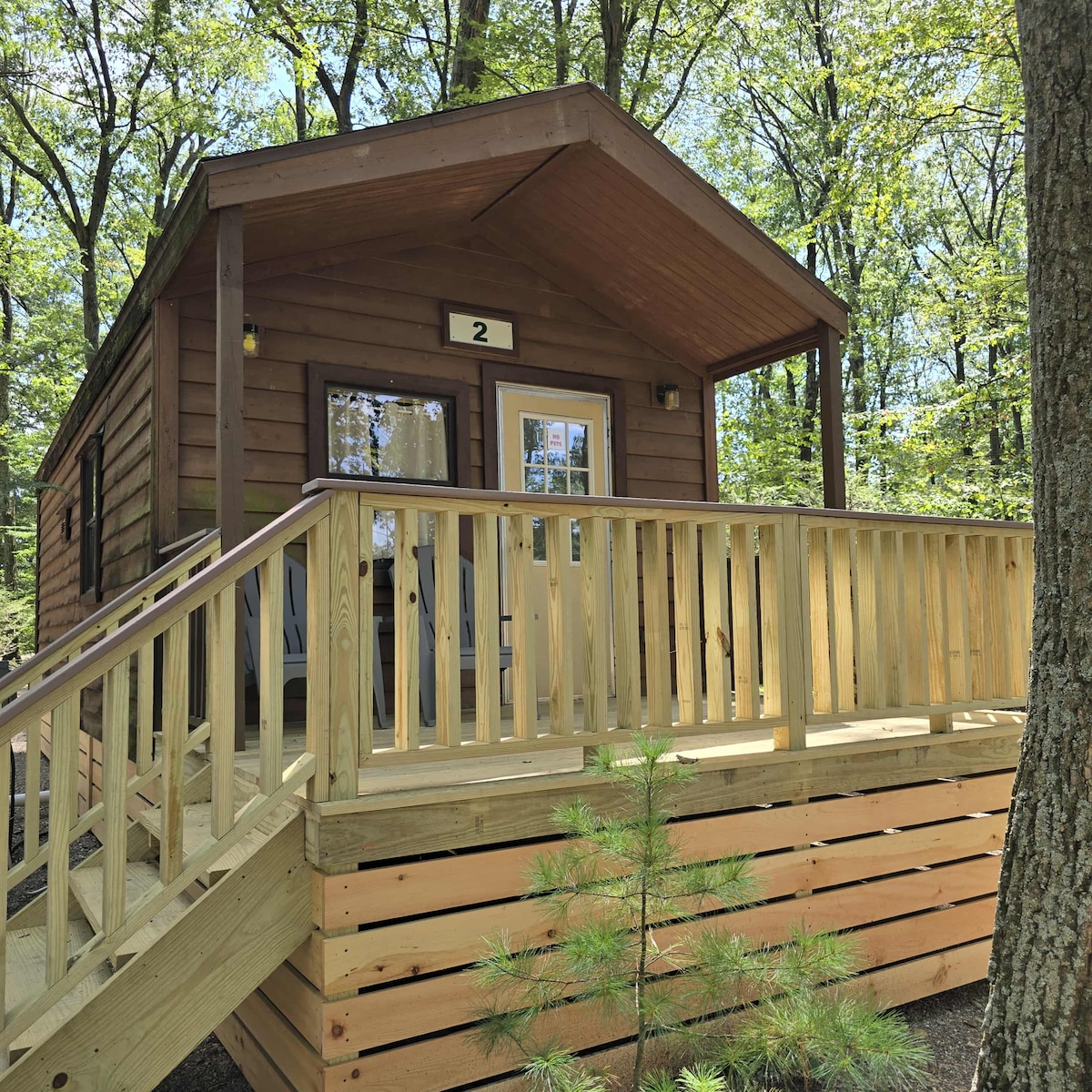 Come relax in one of our cozy cabins located a convenient 1.5 miles from Knoebels amusement resort. Hidden in a quiet wilderness setting, It is an ideal place to get away from a hectic lifestyle. Enjoy one full size bed, two slim bunkbeds, two twin size bunkbeds and two twin size mattresses in crawl /loft with ladder access. Sleep 6 to 8 people. Must bring own bedding/pillows/towels. 4 Adirondack chairs and 3 porch chairs. 1 picnic table. Firewood available for purchase.