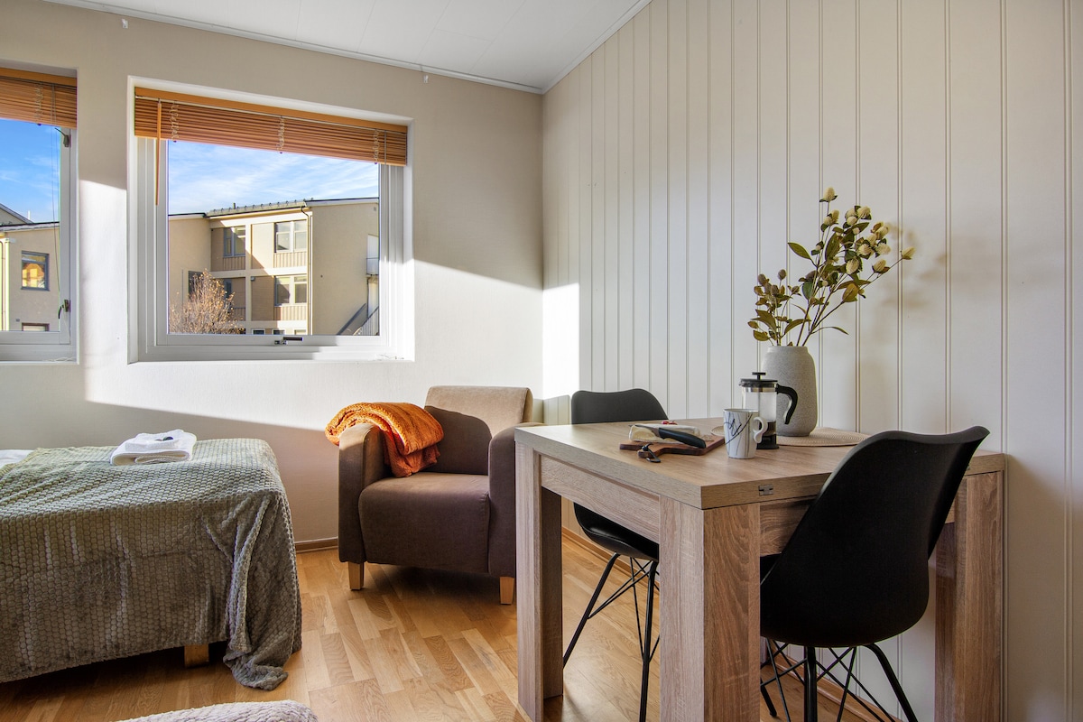 Profitez d'un séjour paisible à Tromsø, à seulement 15 minutes à pied du centre-ville, avec des arrêts de bus juste à l'extérieur. Nos studios lumineux disposent de salles de bains privées, de cuisines entièrement équipées et de lits confortables, parfaits pour les couples ou les voyageurs en solo. Les voyageurs apprécient l'emplacement calme, les sols chauds et l'arrivée autonome. Veuillez noter que le petit déjeuner et le ménage quotidien ne sont pas inclus, ce qui en fait votre propre maison privée loin de chez vous.