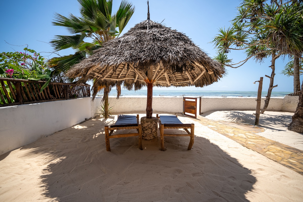 PROPRIÉTÉ AVEC GÉNÉRATEUR DE SECOURS EN CAS DE COUPURE D'ÉLECTRICITÉ !Bienvenue dans notre appartement en bord de mer de style italien et swahili. Il dispose d'une cuisine spacieuse, d'une chambre king size, d'une salle de bain attenante, d'une climatisation, d'une entrée privée sur la plage, d'un charmant jardin. Profitez d'une connexion Internet 24h/24, de la sécurité et d'un canapé pour les voyageurs supplémentaires. Contactez-nous pour les disponibilités. Séjour inoubliable garanti. Oh oui, nous offrons maintenant LE PETIT-DÉJEUNER COMPLET et l'ACCÈS AU COWORKS inclus dans le prix ! !