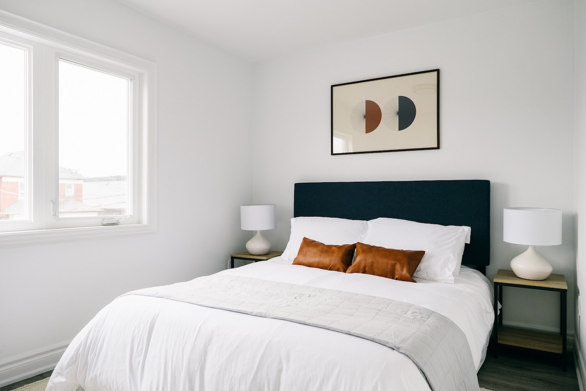 Suite bohème chic 2 chambres au rez-de-chaussée, dans un quartier calme et piéton — à un seul bus du centre-ville, Caribana, du quartier des spectacles et financier ! Salle de bain rénovée de luxe, lits king et queen confort, Wi-Fi rapide, stationnement gratuit. Parfait pour pros, étudiants sérieux ou nomades digitaux en séjour prolongé. Près du transit, St. Clair, Casa Loma, George Brown, Yorkdale et plus.