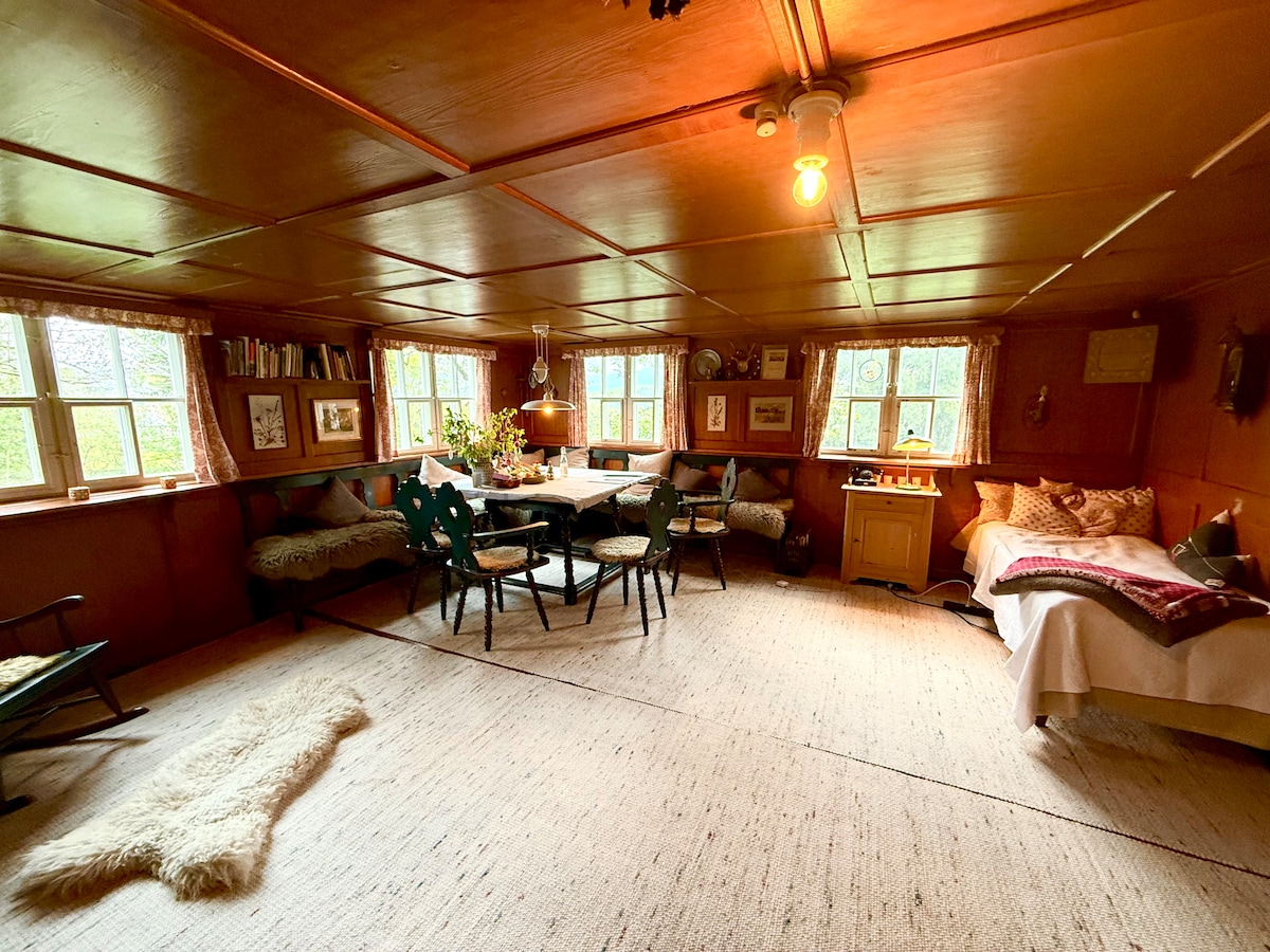 Notre maison a environ 300 ans - une maison de colonie typique en bois, dont il y en a de moins en moins. Nous l'avons restauré de manière écologique et équipé de tout le confort moderne que l'on peut souhaiter : plaque vitrocéramique, four, machine à laver micro-ondes, douche surdimensionnée, machine à laver, wifi, etc. Si vous chauffez au bois en hiver, il y a une odeur confortable dans toute la maison. Le plâtre d'argile assure un climat intérieur confortable. Juste devant la porte, vous trouverez une boulangerie et une sennerei.