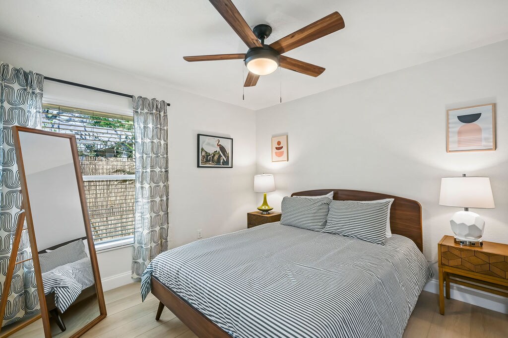 Notre studio 100 % privé vous accueille avec un lit queen size moelleux et une vue paisible sur une oasis tropicale luxuriante. Profitez d'un confort attentionné, notamment d'un lave-linge/sèche-linge complet, d'une salle de bain avec bidet, d'une cheminée en brique confortable, d'un four à micro-ondes, d'une cafetière et d'un mini-réfrigérateur. À quelques pas du parking couvert, votre entrée privée donnant sur la rue offre un accès facile. Restaurant en bord de mer à seulement un feu de circulation ! La maison est située à 8 minutes du centre-ville, à 15 minutes d'Universal et à 30 minutes de Disney !