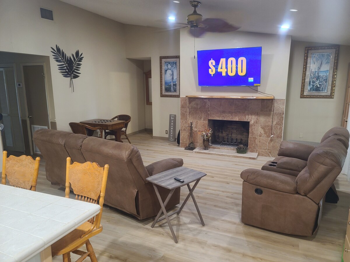 Cette maison de 5 chambres et deux salles de bain avec deux immenses salons, un porche avant grillagé, plusieurs coins repas, une chambre/salle de jeux vidéo, une piscine chauffée à l'eau salée et un jacuzzi, ainsi qu'une cour entièrement clôturée répond à tous les besoins de votre famille pour une belle escapade. Internet haut débit, parking privé et abri auto, animaux acceptés et tous les équipements nécessaires.