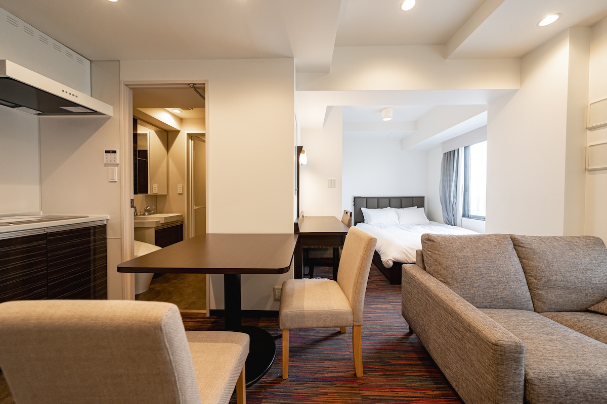 Appartement studio, situé dans le quartier de Higashi-Shinjuku et Shin-Okubo, adapté aux voyageurs en solo ou aux couples. L'espace ouvert dispose d'un lit double, d'une table à manger et de chaises. La cuisine est équipée d'une cuisinière IH à deux feux, d'un four à micro-ondes et d'autres produits de cuisine essentiels. La salle de bain et les toilettes sont séparées, la salle de bain comprenant un dressing et une baignoire. Un balcon arrière est disponible pour laver et sécher le linge.