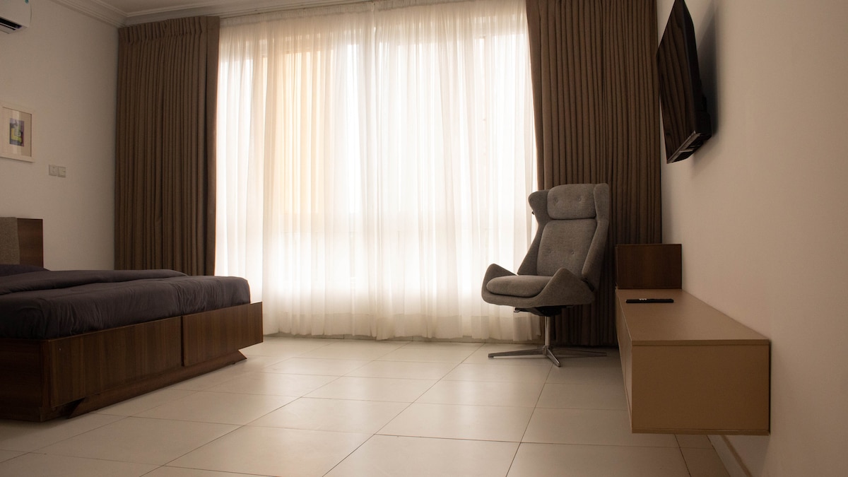 A one bedroom, bathroom and living room apartment with a blend of Afrocentric and modern contemporary wood designs. In house spa- a sauna, steamer and massage rooms-, in house restaurant, gym and coffee lounge, outdoor pool with a poolside Pergola, 24/7 power, security and cctv. It’s ideal for both long and short stays with a minimum of three days located five minutes drive from the international airport and twelve minutes drive from the domestic airport. Airport pickup and dropoffavailable