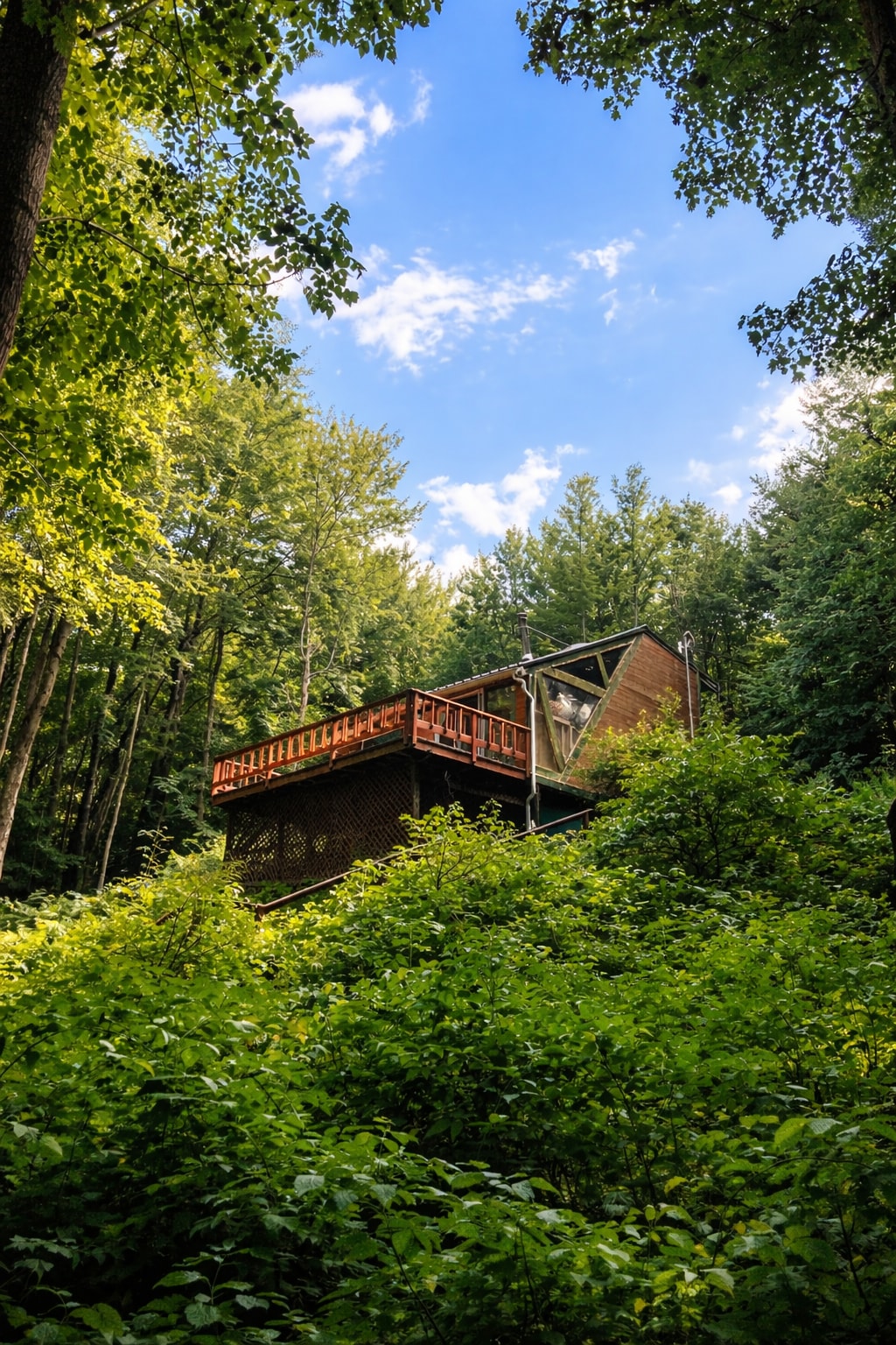 Cabane dans la forêt de fougères : 5 hectares, vue à 360°, jacuzzi et climatisation