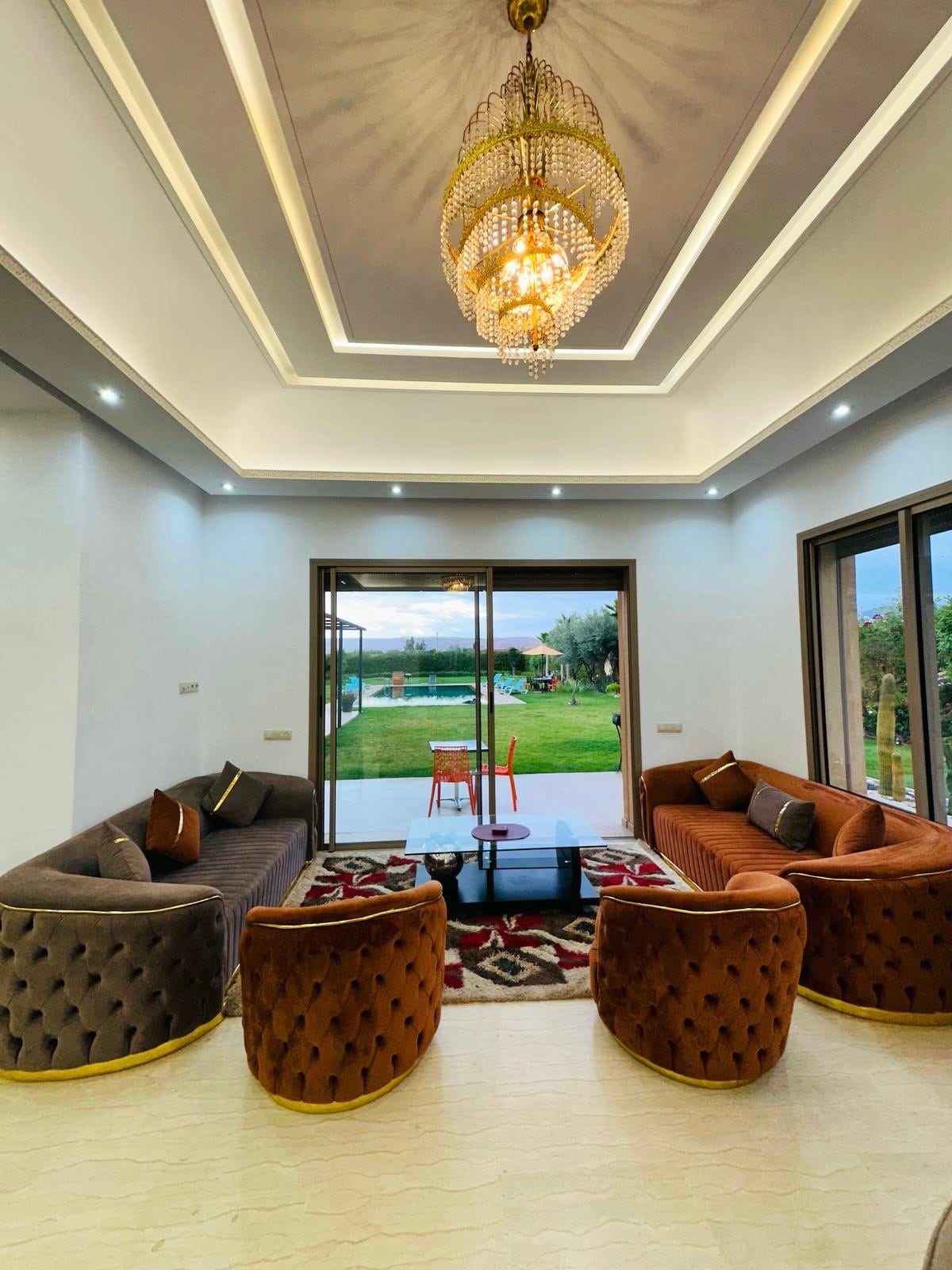 Grande maison avec Piscine, pour se retrouver en famille ou entre amis, jusqu’à 13 personnes. En toute tranquillité. Gardiens sur place à votre disposition . Il y a 5 chambres et 4 salles de bain , une cuisine , un grand espace salon intérieur avec une grande cheminée et un grand espace repas l hiver . Espace repas également dans le jardin l été . Une grande terrasse panoramique d où l on peut voir la chaîne de l atlas et le coucher de soleil .