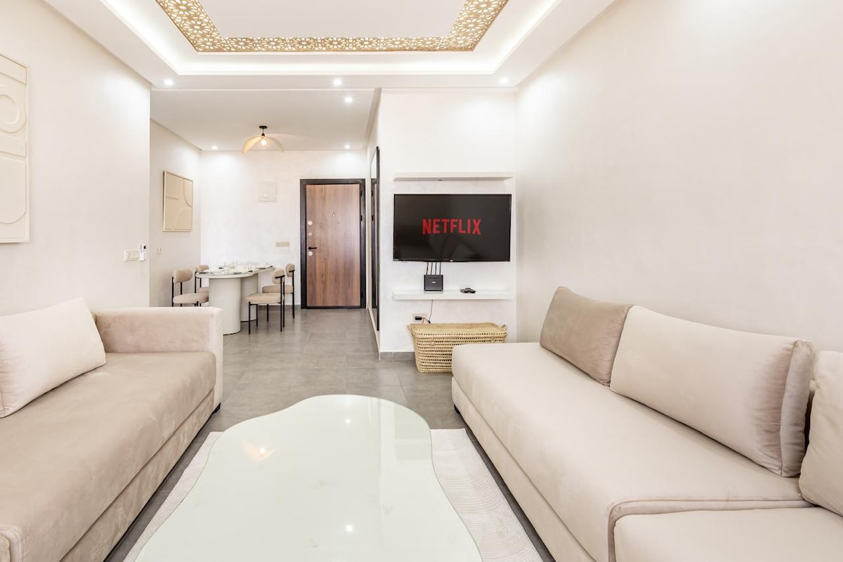 Séjournez en plein cœur de Marrakech dans notre appartement 2 chambres et 2 salles de bain. Profitez d'Une literie Simmons haut de gamme, WiFi haut débit (fibre optique) et d'une décoration moderne avec un bassin privé. Cuisine entièrement équipée, baignoire élégante, et douche italienne. À quelques pas de la place Jemaa el-Fna, du Plazza, et du Carré Eden. La piscine n’est pas chauffée. NB: Les couples marocains non mariés ne sont pas autorisés.