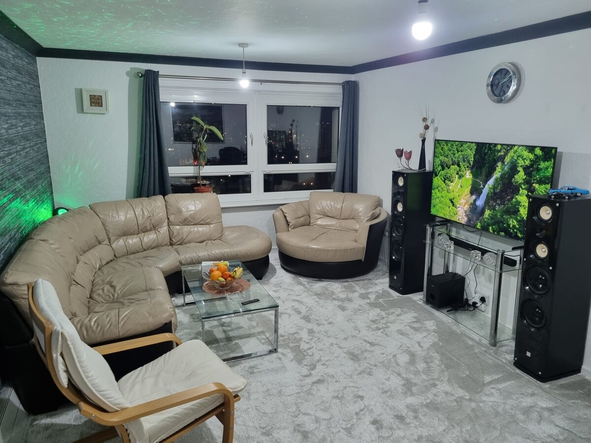 An exceptionally large, spacious 4 bedroom apartment. Close to the City Centre, Pacific Quay (BBC and STV) and the West End with easy travel around Glasgow by Subway. 2 rooms have Super-Kingsize beds, 2 with King-Size beds, 3 bathrooms (1 En-Suite) and a Shower Room (En-Suite). All rooms have Android TV's with WiFi throughout and a vintage Hi-Fi with bluetooth is in the lounge. Modern kitchen with fitted appliances and Washing Machine. Store and take-away food across the street.