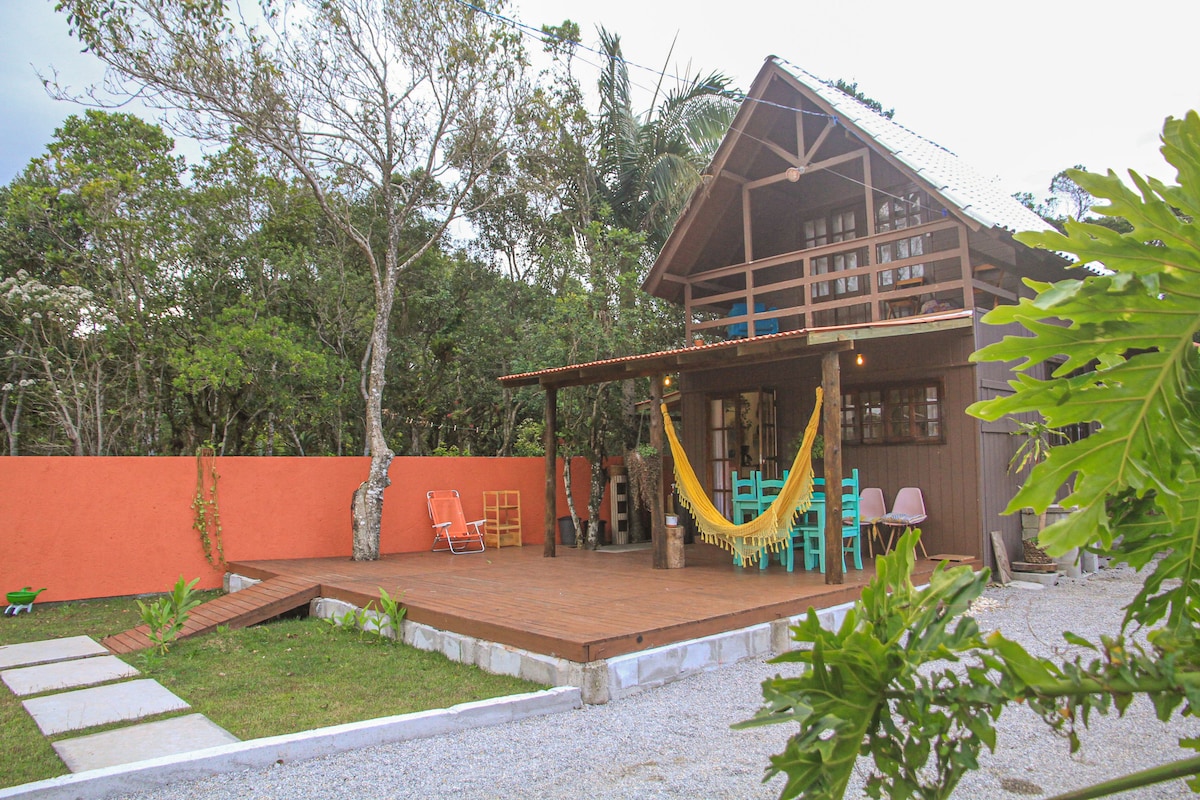 Maison bien éclairée, aérée et confortable. Une chambre avec un lit double, une mezzanine avec un matelas double. Une salle de bain (douche électrique). Espace extérieur avec douche, réservoir, barbecue et parking. Cuisine complète. Balcon et terrasse avec vue sur Pedra do Urubu. Terrain bien boisé. Même à proximité du centre et de la plage (environ 5 minutes à pied - 200 mètres), l'endroit est calme et abrité. Procédures sanitaires adoptées pour un plus grand soin de la santé de tous.