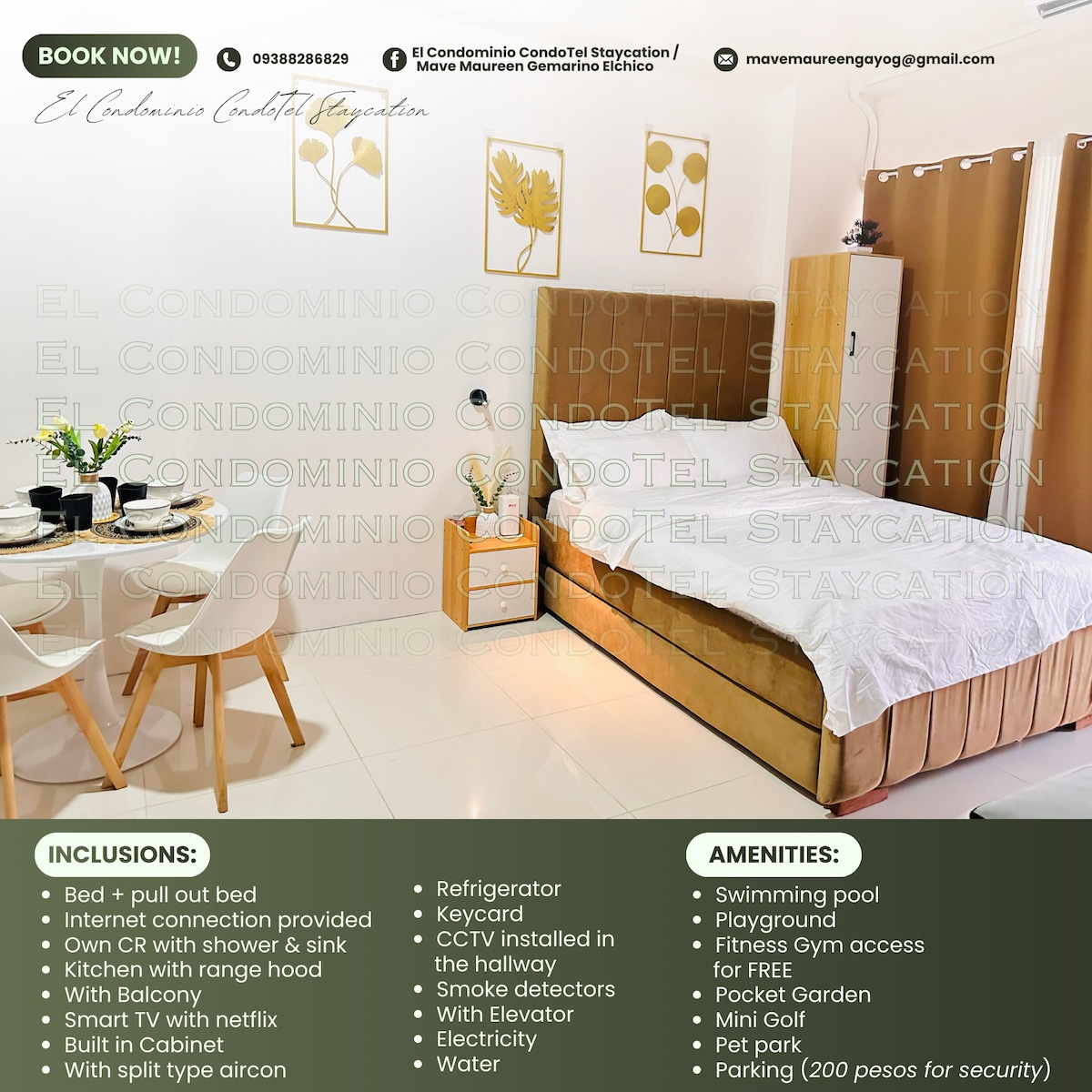 Ce logement élégant et unique prépare le terrain pour un voyage mémorable. CE QUE NOUS OFFRONS : - Piscine - Sécurité 24h/24 et 7j/7 - Entièrement meublé - Un quartier calme pour une détente garantie - Balcon avec une vue imprenable sur le coucher de soleil - Installez-vous dans un logement propre à votre arrivée. Nous allons le ranger et le désinfecter pour vous. ÉQUIPEMENTS À PROXIMITÉ : - Terminal intégré de la ville de Roxas - Marché public de Pueblo de Panay - Robinsons Place Roxas. - Hôpital des médecins de Capiz - DTI et bureau du fonds Pag-Ibig - EPerformax et Université de Perpetual Help
