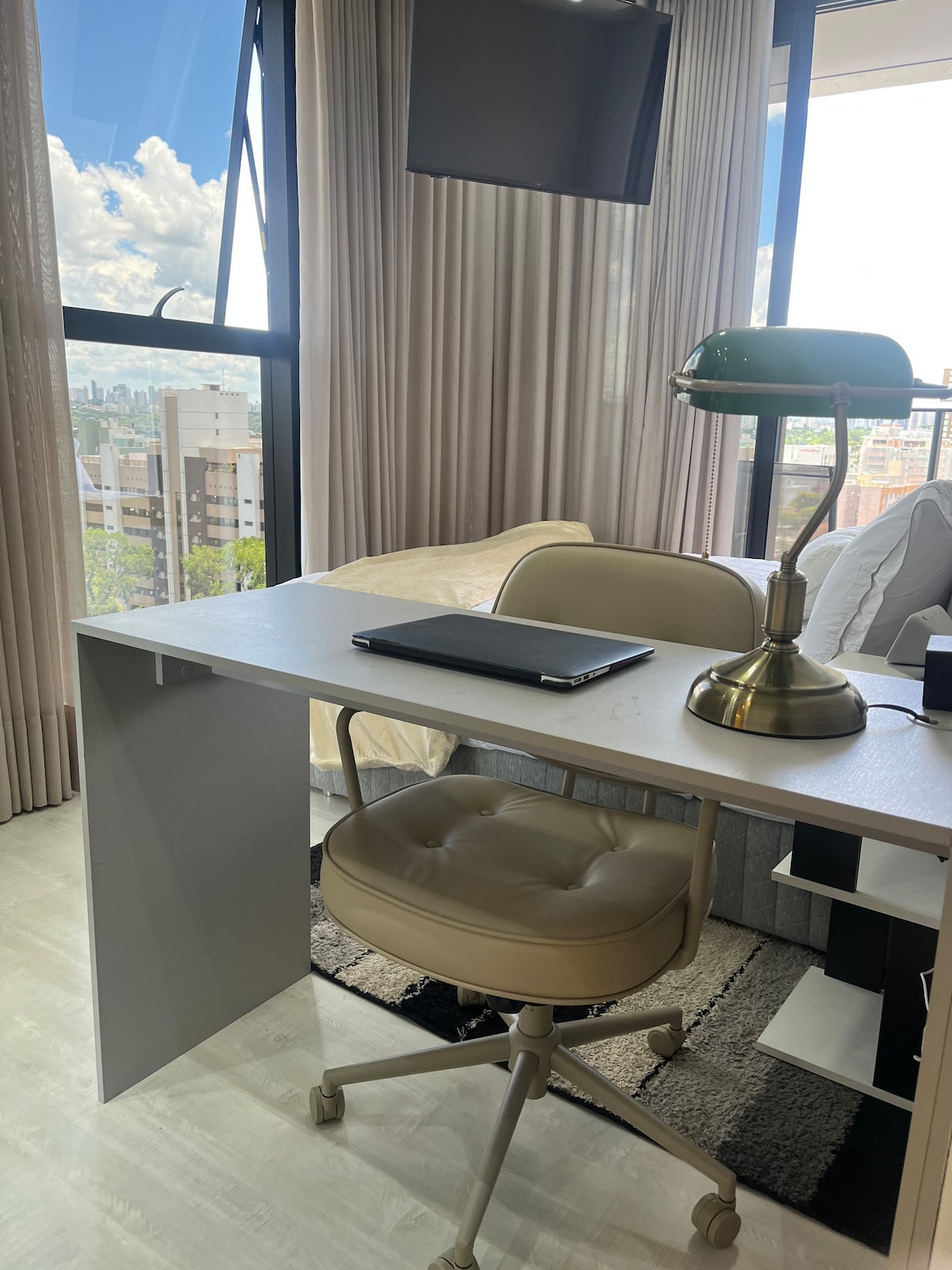 Studio moderne, tout neuf, confortable, emplacement parfait, avec une belle vue depuis le balcon, surtout la nuit. Wi-Fi rapide, bureau, TV smart 55”, lit Queen. Climatisation (chaud/froid). Machine à laver et à sécher le linge et un beau îlot dans la cuisine. 50m2 de style-27ºandar, Silencieux. Au centre-ville/Batel, à proximité des commerces, des banques, des centres commerciaux, du pôle gastronomique et de l'hôpital. Dans le bâtiment : piscine, salle de sport, salle de jeux, sauna, jacuzzi, concierge 24 h/24.