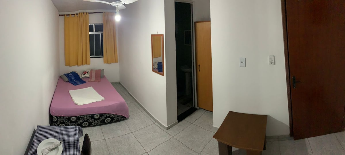 Quarto com 1 cama KING e banheiro privativo, equipado com ar condicionado, TV e Wi-Fi.