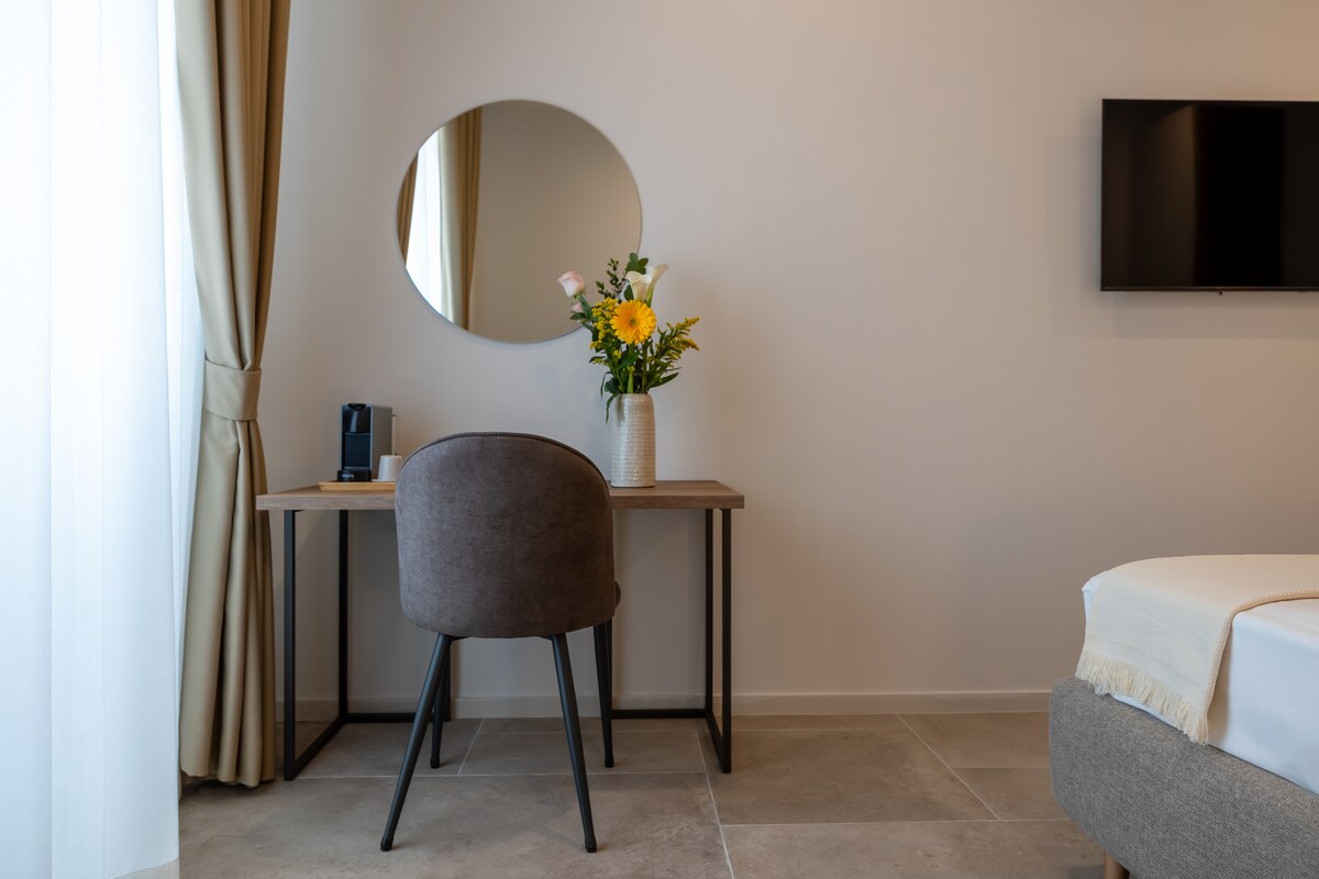 Les chambres sont situées dans une élégante villa à seulement 150 mètres de la mer. Spacieuses et équipées de tout le confort, elles disposent toutes d'une entrée séparée avec un petit patio en face, où vous pourrez vous détendre entre la nature et les odeurs de notre végétation. Toutes sont équipées de: climatisation, réfrigérateur, sèche-cheveux, ligne de courtoisie.