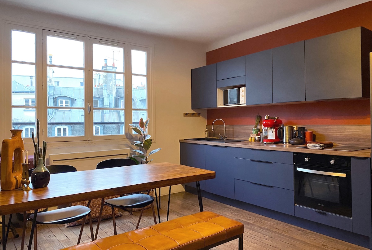 As a food lover, I have created a very personal and unique space for fellow foodies. Located in one of the hippest parts of Paris, my well-equipped kitchen includes a 3m long dining table that seats up to 12 people. The apartment has many original features with a private terrace, bedroom with a double sofa bed, and an original small retro bathroom. While the kitchen is very well equipped all mother comforts are kept to a minimum.