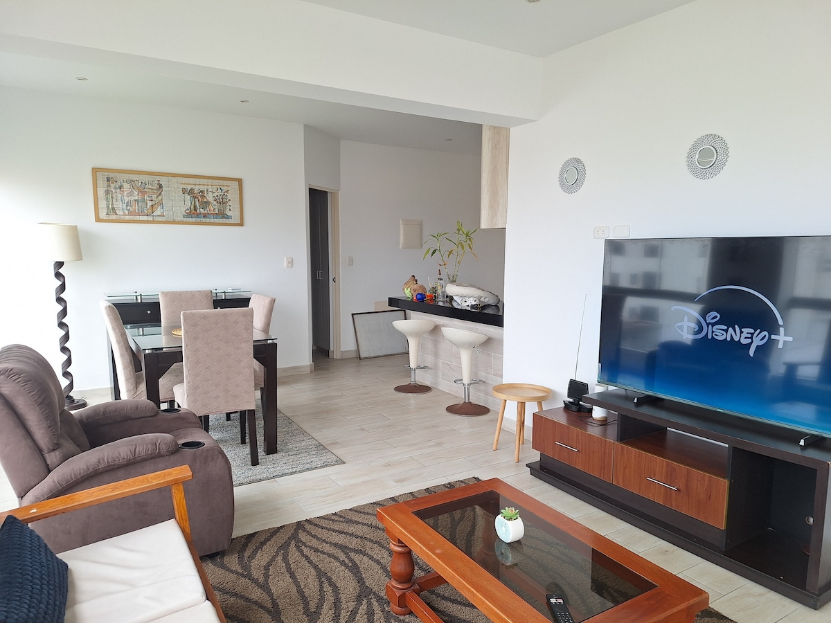 Nous sommes sur la descente de la plage dans le meilleur quartier. Plage caballeros. Belle vue latérale Excellent WIFI, Nous coordonnons le check in, Au quatrième étage avec ascenseur dans un immeuble exclusif, tout confort entièrement meublé, lave-linge, chauffage, cuisine, four. NOUS ACCEPTONS LES PETITS ANIMAUX DE COMPAGNIE (chiens) Parking extérieur commun invités, avec réceptionniste, s'identifier pour entrer, fêtes bruyantes interdites. une chambre avec un lit Queen et une autre chambre avec 2 lits simples.