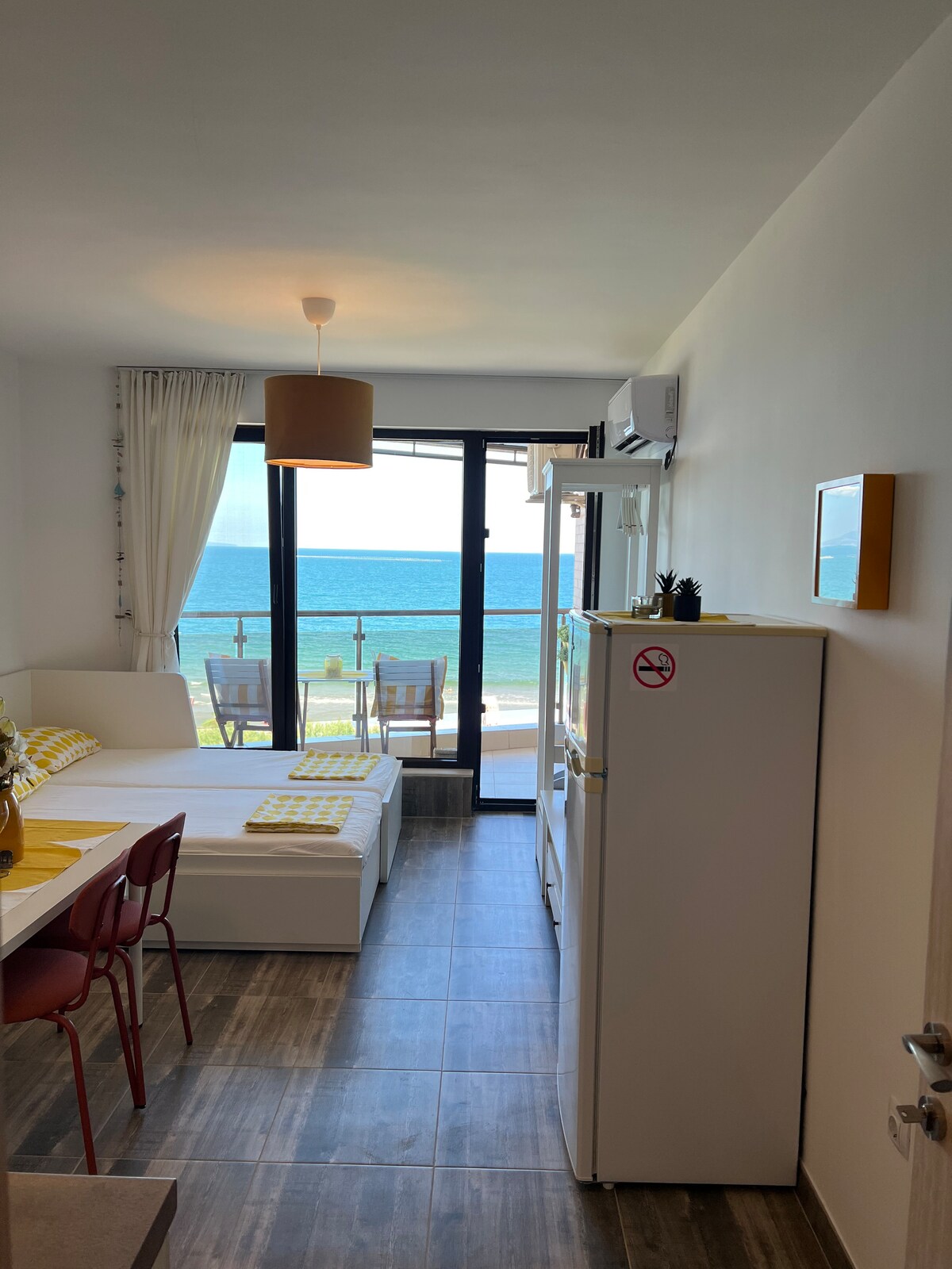 À 8 pas de la plage, il y a un appartement flambant neuf et confortable avec une vue imprenable sur la mer. Tout est proche ! Vous serez en première ligne vers la plage avec une guérison incroyable et du sable doux, afin que vous puissiez entendre les chansons des vagues Sanatorium à 2 min à pied, musée du sel à 5 min à pied, ville de Burgas - 10 km , aéroport - 7 km. La vieille ville et le centre - 10 min à pied. Le train touristique s'arrête juste devant vous. Il y a beaucoup de restaurants, de magasins, d'attractions, de cinéma d'été et de nouveaux parcs aquatiques pour profiter de vos vacances !