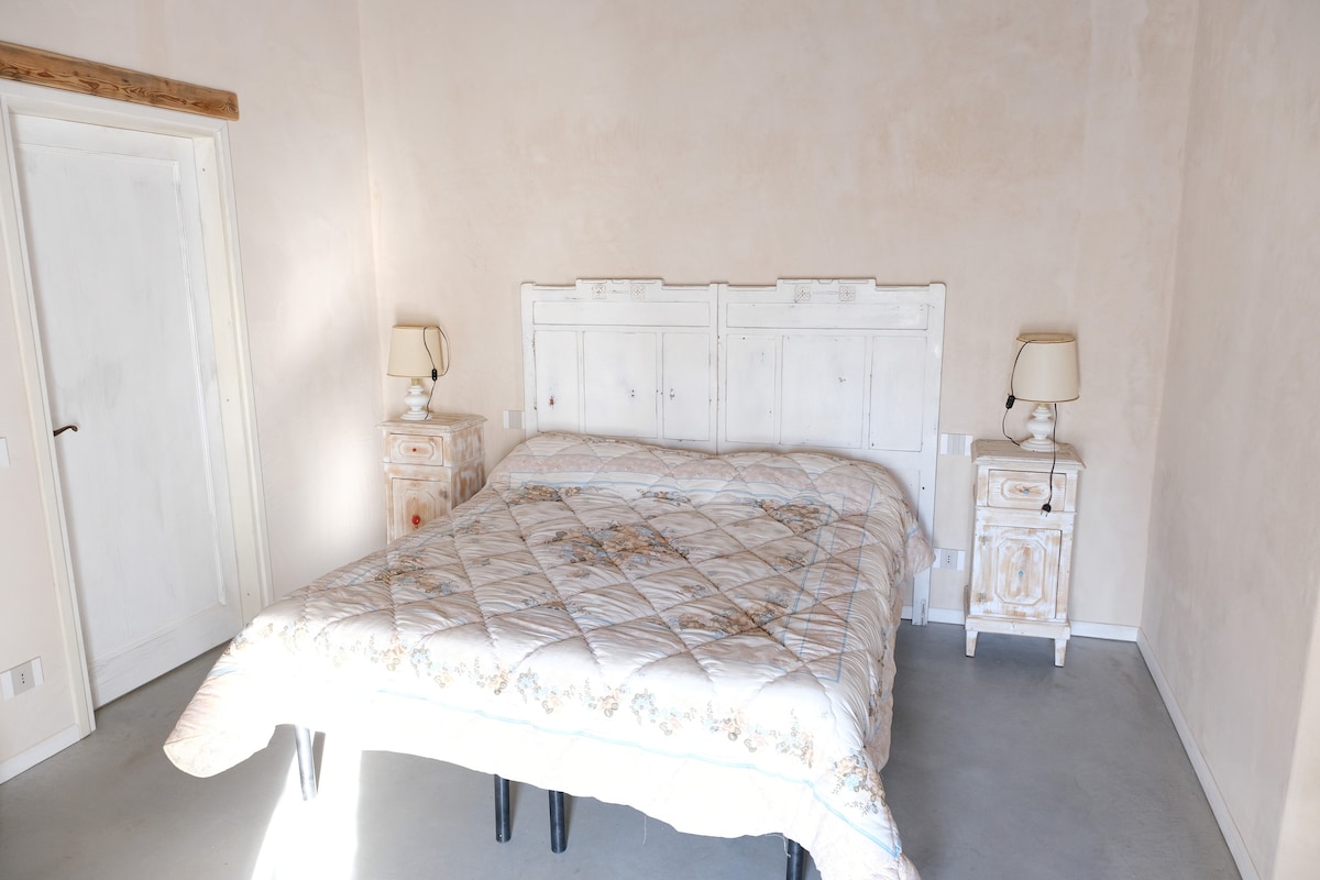 The room is equipped with a queen-sized bed and has a shared bathroom. TV is a wall-mounted television. Room VIGNETO can accommodate up to two guests comfortably. An air-conditioner and a heater are installed in the room.