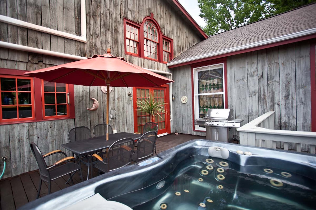 Le Hygge Loft : une cabane moderne du milieu du siècle nichée au milieu de 70 acres de forêt privée avec des rivières et des sentiers de randonnée. Sirotez un expresso ou du vin tout en écoutant des vinyles, confortablement installé près de la cheminée à bois. Promenez-vous dans la forêt jusqu'à la rivière ou admirez les étoiles près du foyer sur la terrasse privée. Offrez-vous un bain luxueux ou blottissez-vous dans le lit king-size ultra confortable avec vue sur la cime des arbres et le ciel tout autour. C'est le genre d'endroit que vous ne voudrez plus jamais quitter !