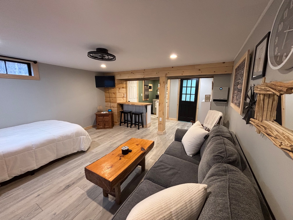 L'appartement se trouve à l'étage à l'arrière de notre brasserie et de notre salle de robinet. L'espace ouvert comprend un salon/salle à manger/espace de travail et une chambre ; la salle de bain dispose d'une petite baignoire à pattes de lion avec douche. Lit Queen Size en mousse à mémoire de forme ; lit double (matelas double supplémentaire en dessous). Télévision HD, Wi-Fi, terrasse privée, kitchenette avec mini-réfrigérateur, four à micro-ondes, grille-pain, bouilloire à thé et cafetière K-Cup. Une pinte de bière artisanale gratuite dans la salle des robinets. Situé dans un cadre privé dans un creux dans les montagnes taconiques.