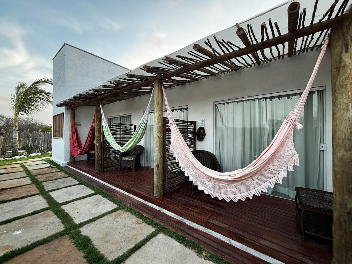 Sur la belle plage de Barra Grande et juste à côté du célèbre et populaire Beach Bar "Trabalha Brasil". Où les clients de la maison de plage profitent de leur petit déjeuner. Le Kite Spot est devant la maison. Grande véranda de plage. La suite est meublée d'une table extérieure, d'une chaise de plage et d'un hamac. Accès privé à la plage et à la piscine