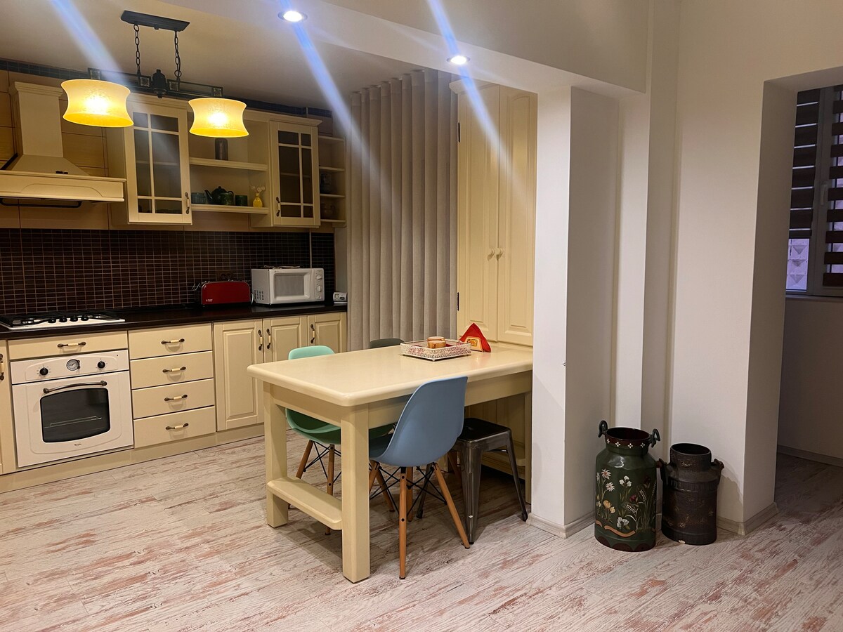 Appartement de luxe, situé au centre avec la possibilité de se rendre à pied à la plupart des institutions de l'État, musées, parcs et à 5 minutes en voiture ou en transports en commun vers les principaux centres commerciaux. L'appartement est au rez-de-chaussée d'un pâté de maisons, il est divisé en 2 chambres, un lit queen size, un canapé-lit, un espace récréatif, une salle à manger, une cuisine ouverte entièrement équipée et une salle de bains moderne avec cabine de douche. Les voitures de stationnement peuvent être faites devant le pâté de maisons.