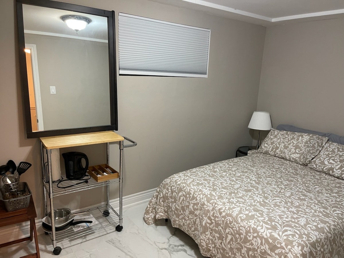 Détendez-vous avec votre ami dans ce logement paisible. avec une arrivée autonome. complètement privé. Cet endroit est très propre et calme pour se détendre. Avec chauffage central et climatisation. Situé sur l'axe Dixie et Peter Robinson. À 2 minutes à pied du Tim Hortons ouvert 24h/24, de la CIBC et d'une supérette. Aslo à 5 minutes à pied du centre commercial Trinity où vous avez la salle de SPORT Fit 4 Less, le cinéma CINPLEX, la banque TD, la boutique de métro, le magasin et les restaurants de la LCBO et de nombreux magasins de créateurs.