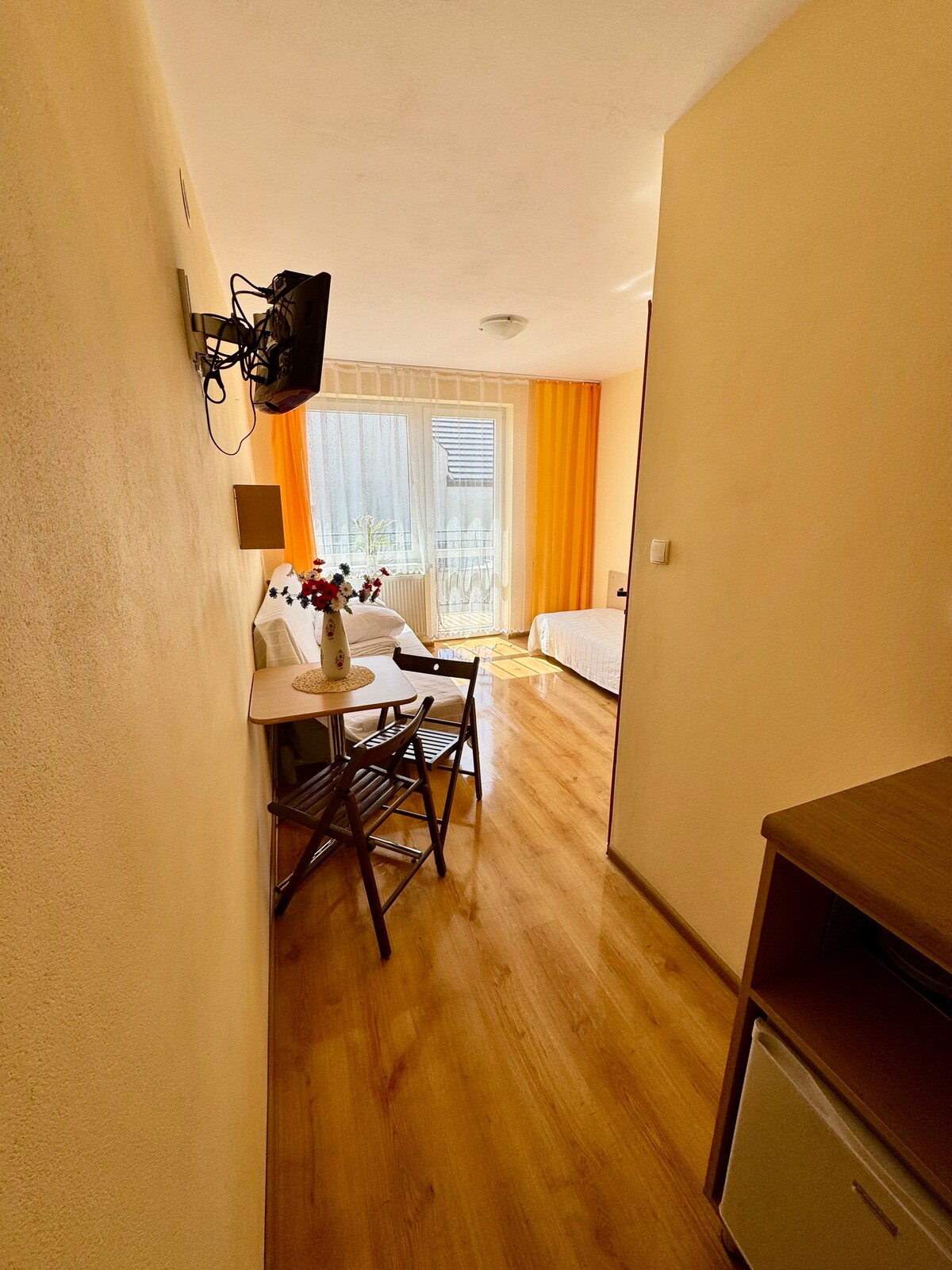 Chambre simple pour de courtes réunions d'affaires ou des séjours plus longs avec un lit de 110 cm x 200 cm. Il y a un balcon, un bureau, une télévision, Internet, une salle de bain avec douche, douche et shampoing, serviettes, sèche-cheveux, eau potable, cafetière et théière, grand parking surveillé gratuit. Emplacement fantastique à proximité immédiate de Tricity et des villes de vacances estivales comme Mechelinki et Rewa.