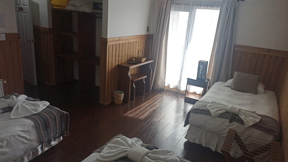 Bonjour ! À Breathe Patagonia, nous sommes très proches de la ville, nous apprécions la tranquillité rurale. La vue de notre hôtel est privilégiée. Ce prix comprend le petit déjeuner américain et le service de ménage pour 12 personnes dans 6 chambres doubles avec salle de bain privée, couvrant un étage de l'hôtel. Nous avons une capacité totale de 16 passagers et nous avons des espaces pour travailler à distance. Demandez des chambres disponibles pas de soucis nous vous attendons !