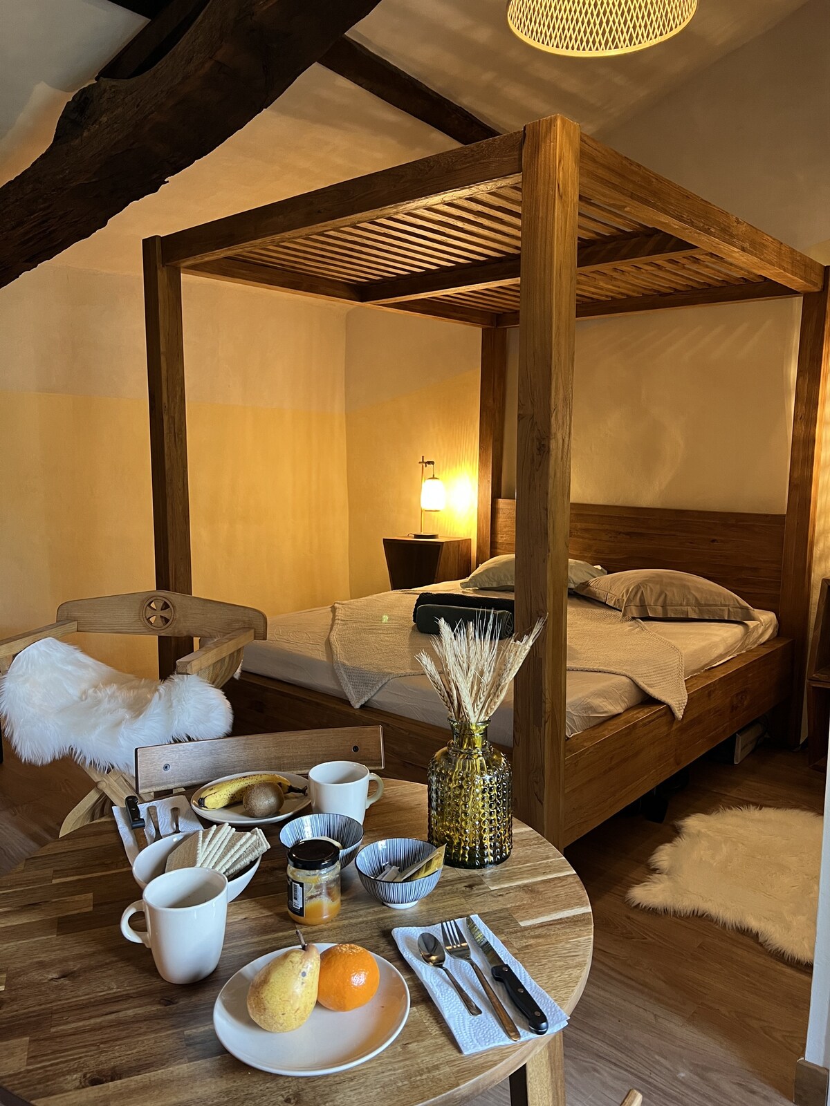 Ancien pavillon de chasse de la Reine Margot, le château de la Vernède vous accueille dans la suite des Tilleuls. Climatisée et lumineuse, elle peut accueillir jusqu'à 3 personnes avec ses 2 chambres, idéale pour une escale romantique en Auvergne ou pour ralentir un peu, à 6 km de l' A75 et d'Issoire. Petits déjeuners (confitures maison, croissants du village) compris et animaux bienvenus. Auberges et restaurants gourmands à proximité, les volcans d'Auvergne, le Parc Naturel du Livradois aussi !