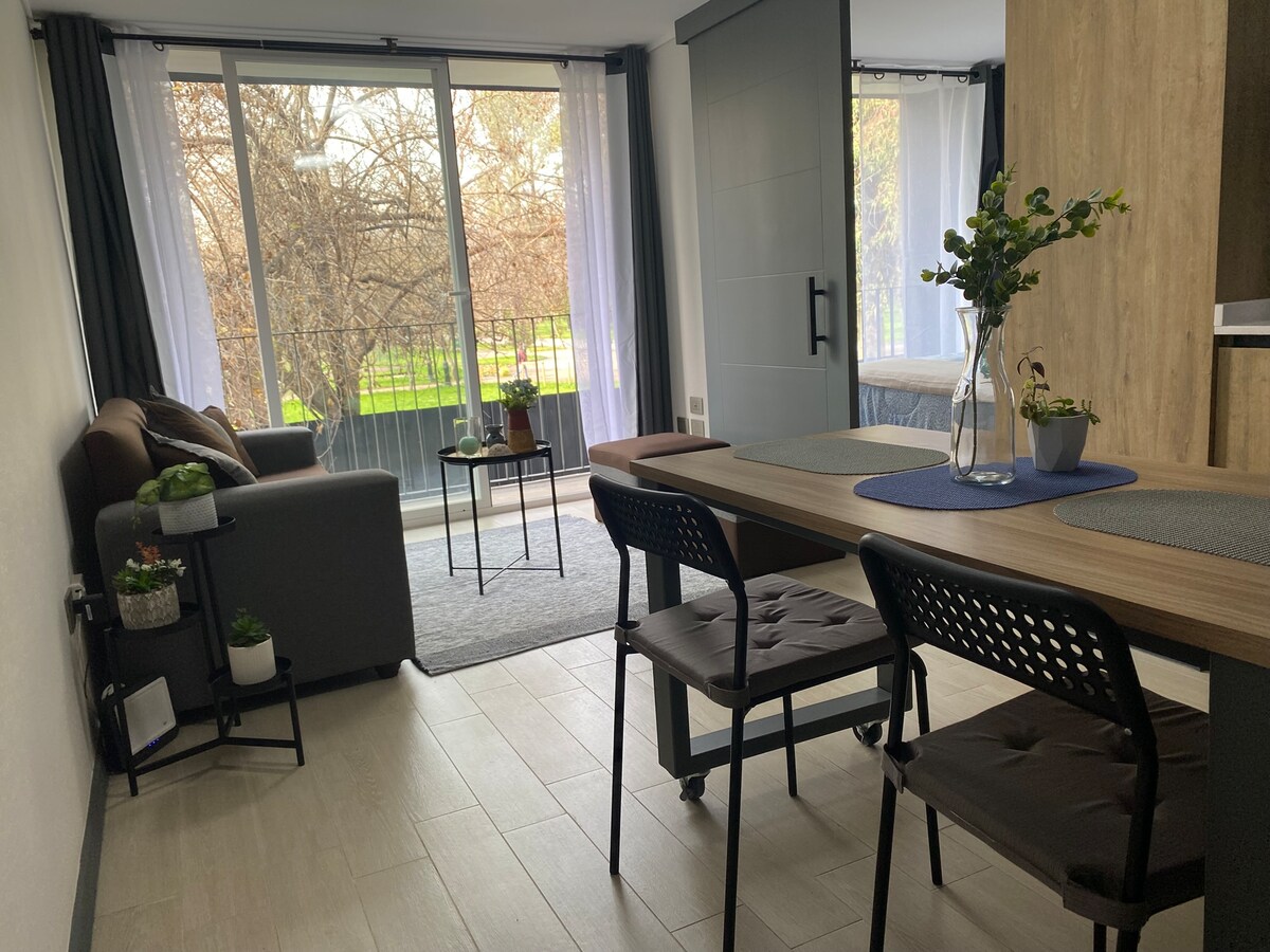 Profitez d'un séjour chaleureux au cœur de Santiago. Un espace idéal pour deux personnes, en face du parc emblématique et à seulement quelques minutes à pied du métro. Avec un design confortable qui combine modernité et fonctionnalité pour vous offrir le repos que vous méritez. Emplacement privilégié : connexion directe aux musées, aux transports en commun et aux quartiers historiques. Il dispose d'une connexion Wi-Fi rapide, d'une cuisine équipée, d'un lit confortable et de la lumière naturelle. Vue sur le parc et tranquillité urbaine : un refuge au milieu de la ville.