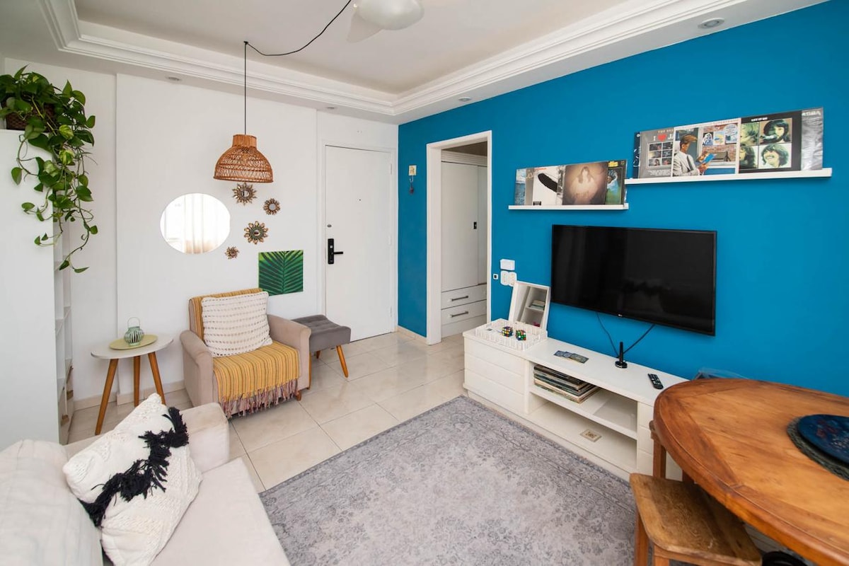 Boho chic style apartment, on the Copacabana beach! - Queen bed, sofa bed, dining table, air conditioning and space for home office (Wifi 300Mbps). Kitchen with stove, refrigerator, oven, microwave, blender, coffee maker, juicer, sandwich maker, pans, kitchen utensils, various books, guitar and TV with apps. - Market and pharmacy under the building, restaurants and shops around the apartment. - Airport at 8.3km - Cristo Redentor at 11.5km - Pão de Açúcar at 2.8km