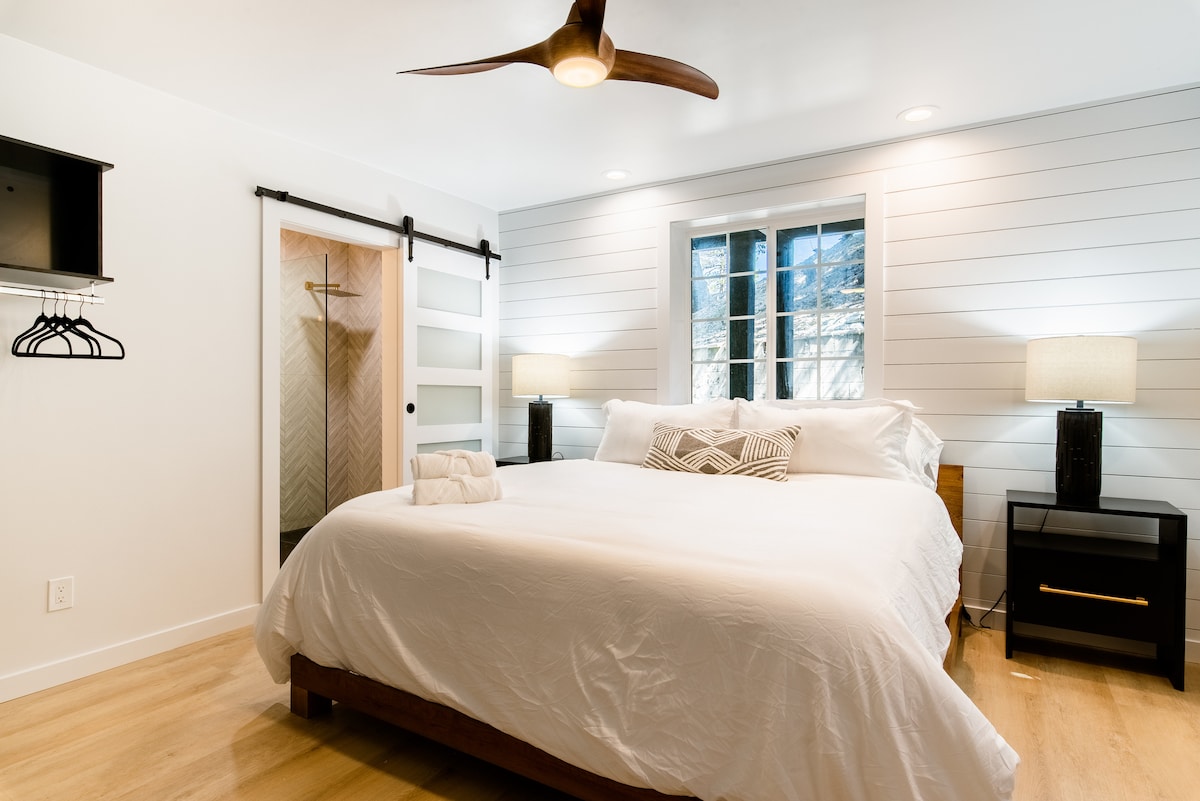 Détendez-vous dans notre studio moderne Queen à l'hôtel Kingsley, une retraite de montagne de charme à quelques minutes seulement du village de Lake Arrowhead. Conçu pour le confort et la simplicité, le studio dispose d'un lit queen confortable, d'une salle de bain attenante, d'une télévision connectée, d'une connexion Wi-Fi rapide, d'un réfrigérateur à boissons et d'une arrivée autonome numérique facile. Vous pourrez vous détendre dans le club-house communautaire partagé avec des sièges de salon et une cheminée intérieure, ou profiter d'un dîner en plein air et de la table de feu, parfait pour une escapade paisible en montagne.