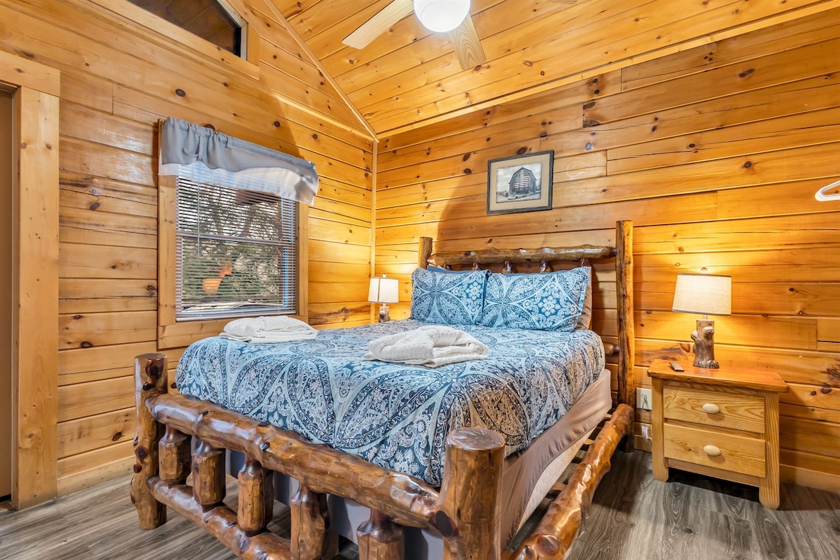 Hugs and Kisses est parfait pour votre lune de miel, une escapade romantique ou de petites familles. La grande chambre comprend une baignoire jacuzzi en forme de cœur, une cheminée, une télévision à écran plat et une salle de bains privative. Le bain à remous est situé sur la terrasse privée tandis que nos chaises berçantes et notre barbecue sont situés à l'avant de la cabine. Nous disposons également d'une table de billard, d'Internet et d'une télévision par câble. Nous disposons d'une cuisine entièrement équipée, d'une petite table à manger, d'un bar à petit-déjeuner et d'un salon avec un canapé-lit, d'une cheminée et d'une grande télévision à écran plat.