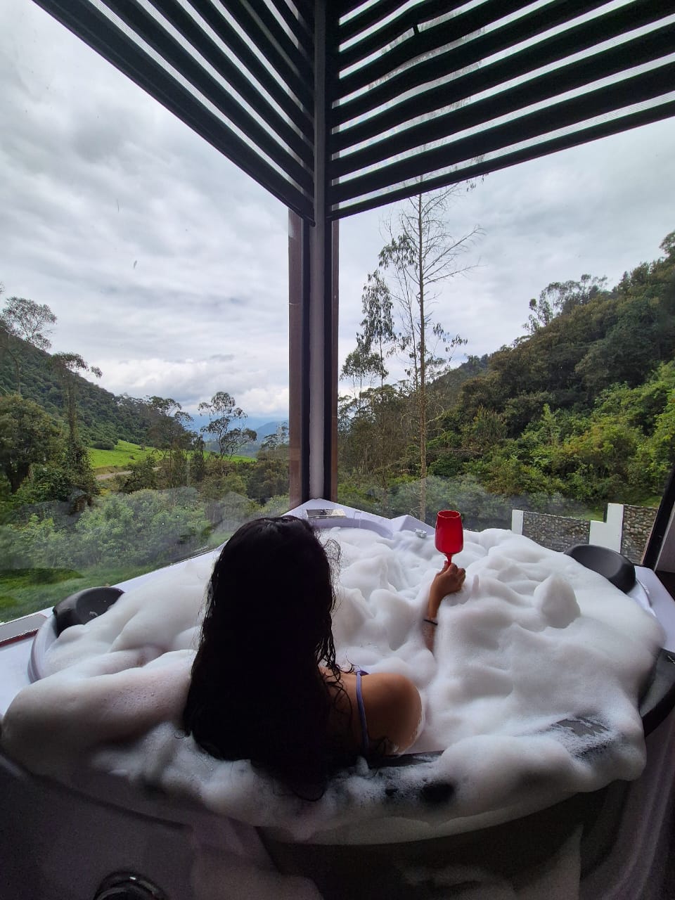 Disfruta del encantador entorno de este romántico lugar en la naturaleza. Relájate en nuestra tina de baño con vista hermosa hacia los árboles. Somos los cómplices de tus momentos especiales, si gustas decoraciones o recomendaciones de lugares en Riobamba, estaremos gustosos de servirte en la casa principal situada frente a la suite.