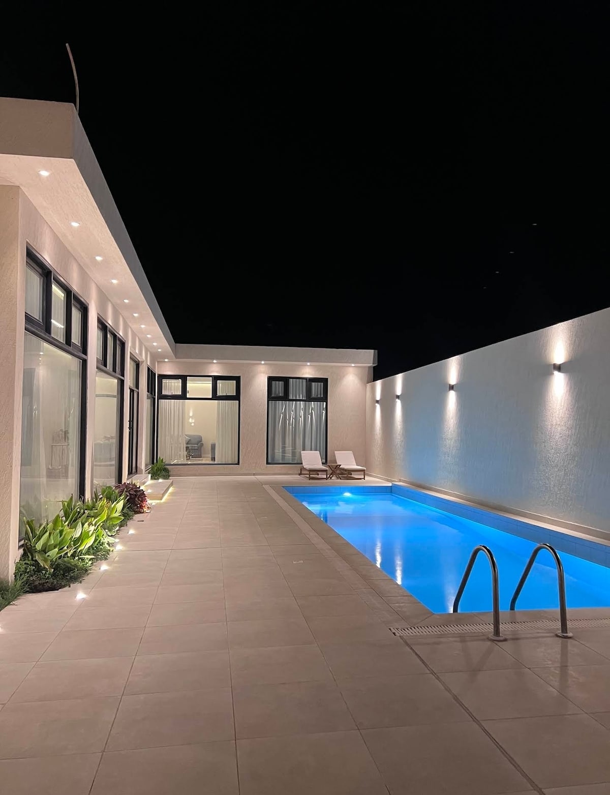 شالية أنيق بمسبح خارجي ومجلس راقي وغرفة نوم خاصة .