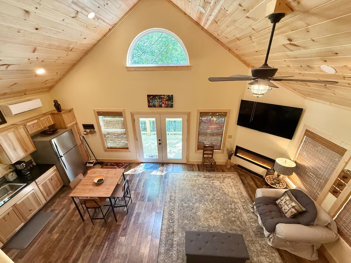 Déconnectez-vous du monde et profitez d'une escapade au bord de la rivière !!!!! Décor confortable et grand lit pour se détendre ! Cafetière et tous les essentiels dans la cuisine pour vos repas au bord du lac !! Descendez jusqu'à l'eau pour vous baigner, pêcher ou faire du bateau. Centre-ville d'Eureka Springs à 12 minutes du chalet. Ce chalet est pour 2 adultes seulement !! Aucun animal n'est autorisé en aucune circonstance pour des raisons de santé et de sécurité, d'allergies graves et de sécurité des poulets en liberté sur la propriété.
