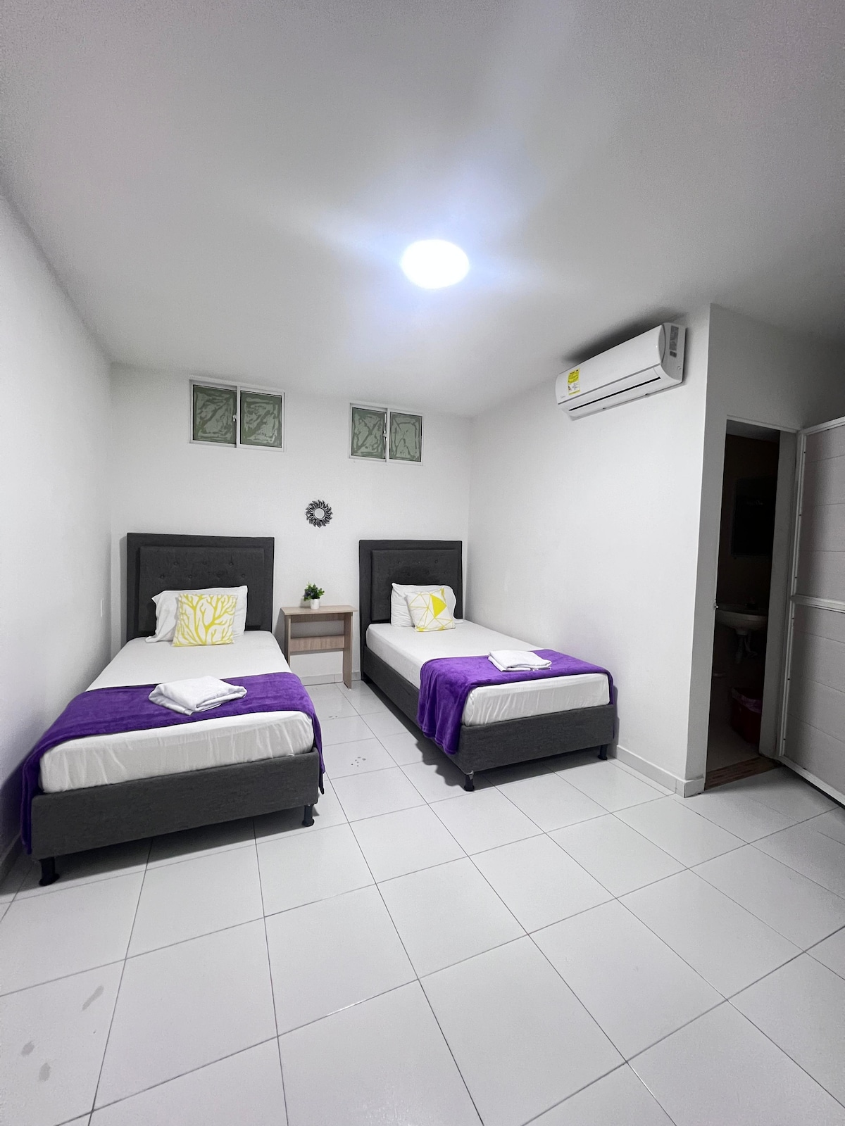 Chambres confortables, principale dispose d'une salle de bain et d'un dressing privé, 1 lit Queen, un lit simple, wifi, Air conditionné pour 3 personnes. La deuxième dispose d'un lit double et d'une salle de bains simple, du wifi et de la climatisation pour trois personnes. La 3, 2 lits simples 2 personnes droit à : lave-linge, cuisine, réfrigérateur, piscine, salle de sport, et parking Proche des centres commerciaux, et 4 supermarchés, à 30 minutes de certaines plages telles que, port salgar, turipana, port Colombie, pradomar entre autres.